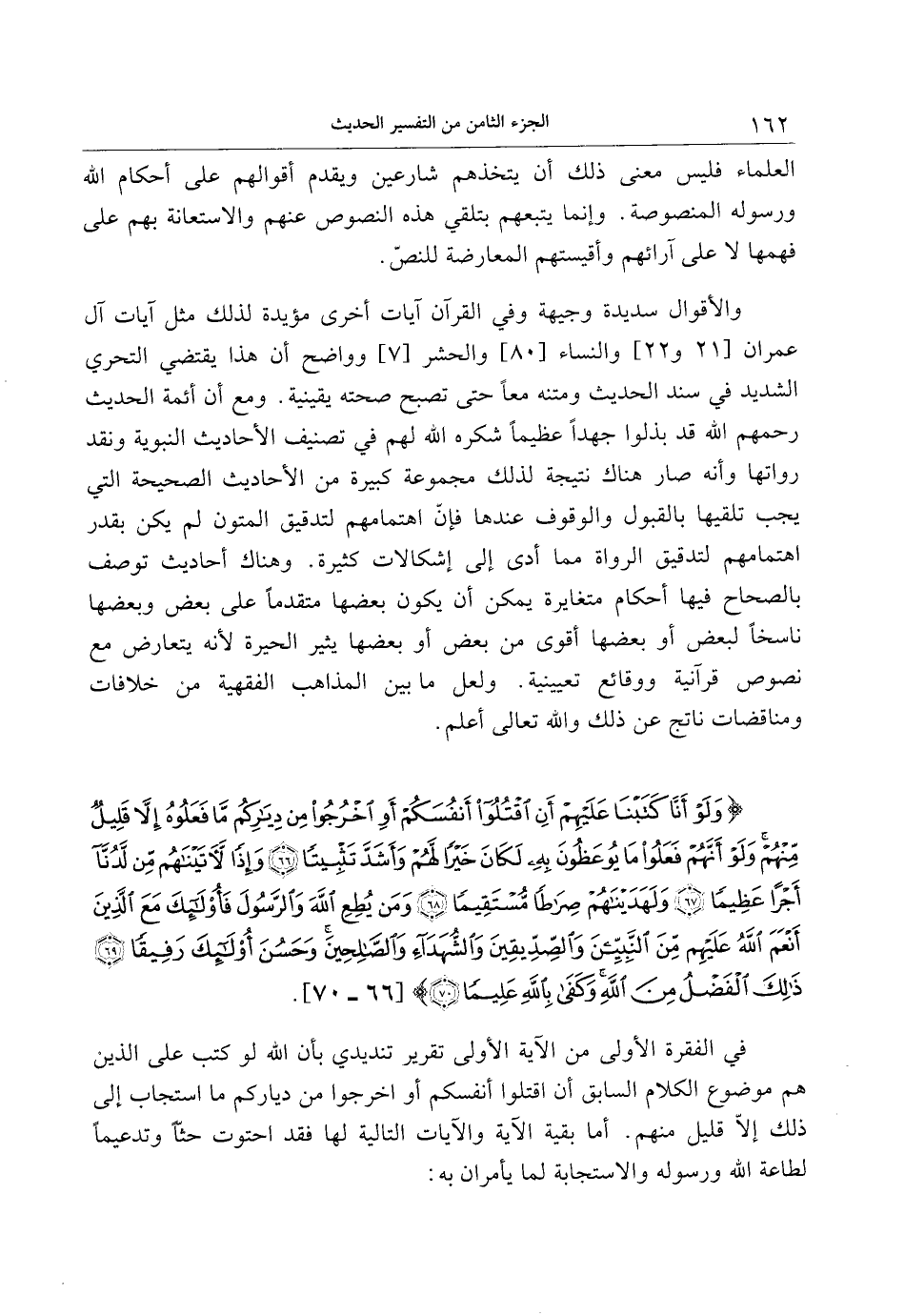 وَلَوْ أَنَّا كَتَبْنا عَلَيْهِمْ أَنِ اقْتُلُوا أَنْفُسَكُمْ أَوِ اخْرُجُوا مِنْ دِيارِكُمْ ما فَعَلُوهُ إِلاَّ قَلِيلٌ مِنْهُمْ وَلَوْ أَنَّهُمْ فَعَلُوا ما يُوعَظُونَ بِهِ لَكانَ خَيْراً لَهُمْ وَأَشَدَّ تَثْبِيتاً (66) وَإِذاً لَآتَيْناهُمْ مِنْ لَدُنَّا أَجْراً عَظِيماً (67) وَلَهَدَيْناهُمْ صِراطاً مُسْتَقِيماً (68) وَمَنْ يُطِعِ اللَّهَ وَالرَّسُولَ فَأُولئِكَ مَعَ الَّذِينَ أَنْعَمَ اللَّهُ عَلَيْهِمْ مِنَ النَّبِيِّينَ وَالصِّدِّيقِينَ وَالشُّهَداءِ وَالصَّالِحِينَ وَحَسُنَ أُولئِكَ رَفِيقاً (69) ذلِكَ الْفَضْلُ مِنَ اللَّهِ وَكَفى بِاللَّهِ عَلِيماً (70)