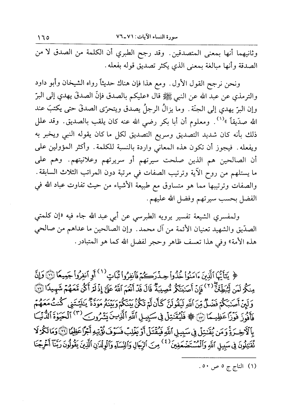 ولمفسري الشيعة تفسير يرويه الطبرسي عن أبي عبد الله جاء فيه «إن كلمتي الصدّيق والشهيد تعنيان الأئمة من آل محمد. وإن الصالحين ما عداهم من صالحي هذه الأمة» وفي هذا تعسف ظاهر وحجر لفضل الله كما هو المتبادر.
