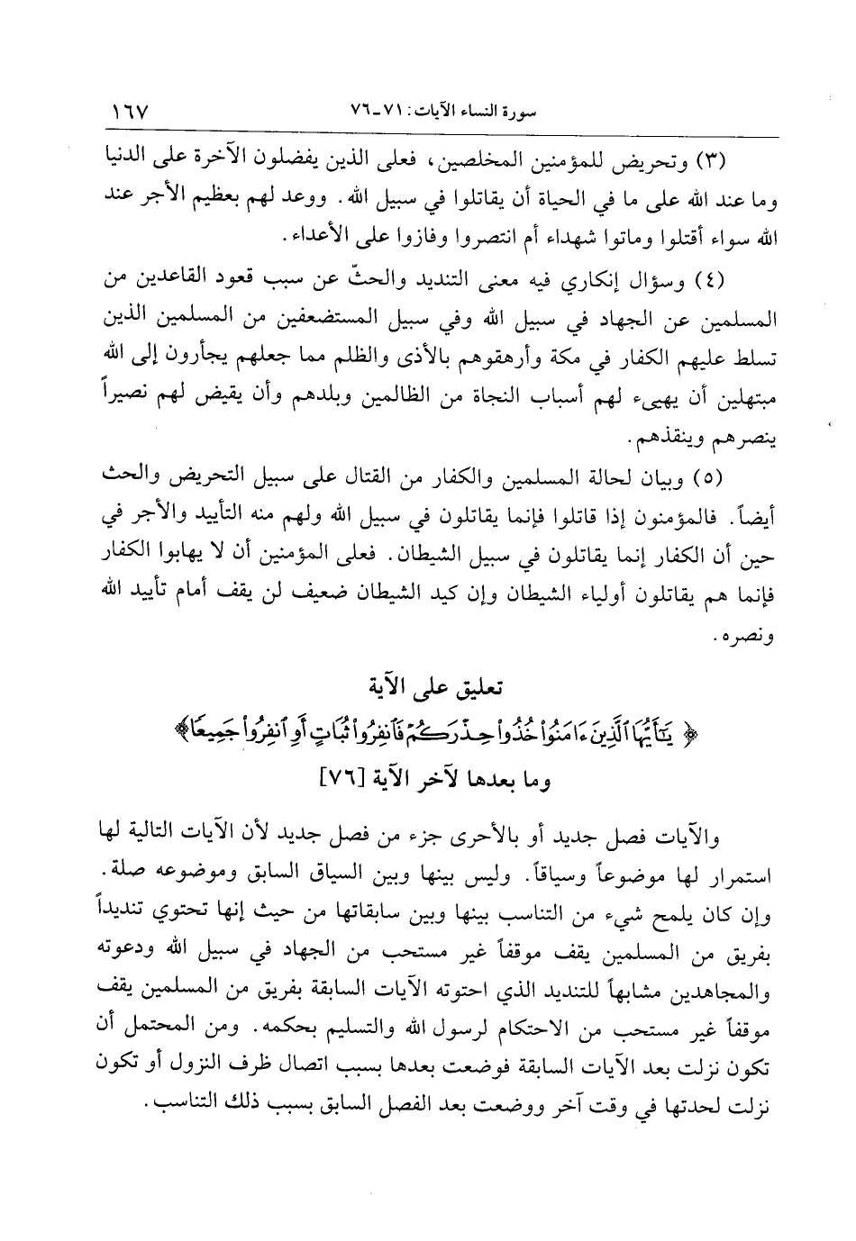 تعليق على الآية يا أَيُّهَا الَّذِينَ آمَنُوا خُذُوا حِذْرَكُمْ فَانْفِرُوا ثُباتٍ أَوِ انْفِرُوا جَمِيعاً وما بعدها لآخر الآية [76]