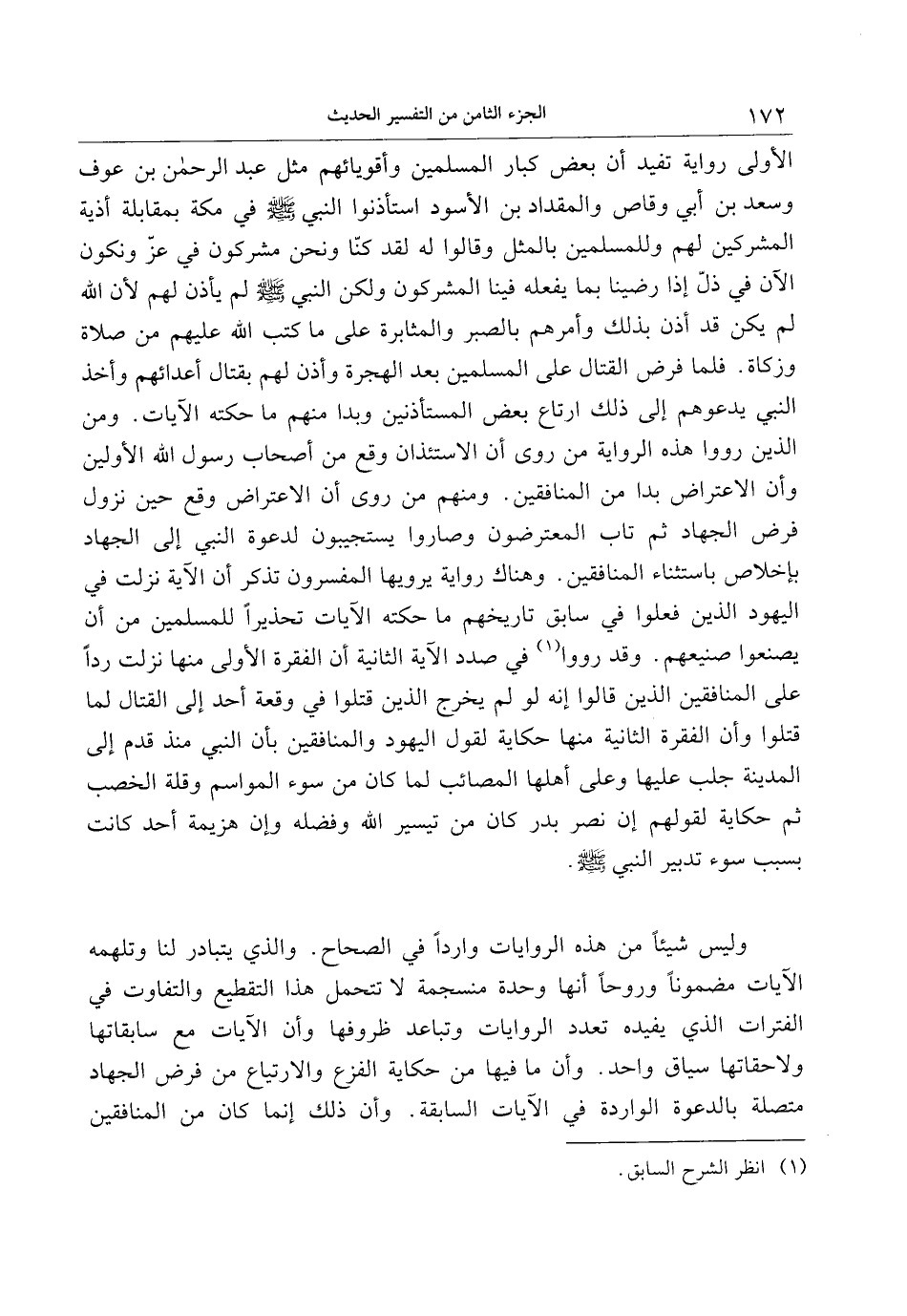 وليس شيئا من هذه الروايات واردا في الصحاح. والذي يتبادر لنا وتلهمه الآيات مضمونا وروحا أنها وحدة منسجمة لا تتحمل هذا التقطيع والتفاوت في الفترات الذي يفيده تعدد الروايات وتباعد ظروفها وأن الآيات مع سابقاتها ولا حقاتها سياق واحد. وأن ما فيها من حكاية الفزع والارتياع من فرض الجهاد متصلة بالدعوة الواردة في الآيات السابقة. وأن ذلك إنما كان من المنافقين