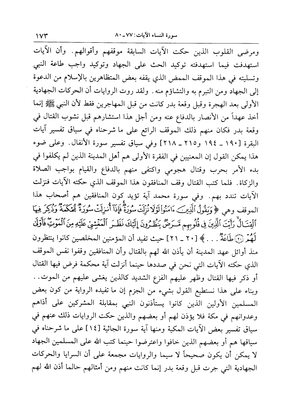 ومرضى القلوب الذين حكت الآيات السابقة موقفهم وأقوالهم. وأن الآيات استهدفت فيما استهدفته توكيد الحث على الجهاد وتوكيد واجب طاعة النبي وتسليته في هذا الموقف الممض الذي يقفه بعض المتظاهرين بالإسلام من الدعوة إلى الجهاد ومن التبرم به والتشاؤم منه. ولقد روت الروايات أن الحركات الجهادية الأولى بعد الهجرة وقبل وقعة بدر كانت من قبل المهاجرين فقط لأن النبي صلى الله عليه وسلم إنما أخذ عهدا من الأنصار بالدفاع عنه ومن أجل هذا استشارهم قبل نشوب القتال في وقعة بدر فكان منهم ذلك الموقف الرائع على ما شرحناه في سياق تفسير آيات البقرة [190- 194 و 215- 218] وفي سياق تفسير سورة الأنفال. وعلى ضوء هذا يمكن القول إن المعنيين في الفقرة الأولى هم أهل المدينة الذين لم يكلفوا في بدء الأمر بحرب وقتال هجومي واكتفى منهم بالدفاع والقيام بواجب الصلاة والزكاة. فلما كتب القتال وقف المنافقون هذا الموقف الذي حكته الآيات فنزلت الآيات تندد بهم. وفي سورة محمد آية تؤيد كون المنافقين هم أصحاب هذا الموقف وهي وَيَقُولُ الَّذِينَ آمَنُوا لَوْلا نُزِّلَتْ سُورَةٌ فَإِذا أُنْزِلَتْ سُورَةٌ مُحْكَمَةٌ وَذُكِرَ فِيهَا الْقِتالُ رَأَيْتَ الَّذِينَ فِي قُلُوبِهِمْ مَرَضٌ يَنْظُرُونَ إِلَيْكَ نَظَرَ الْمَغْشِيِّ عَلَيْهِ مِنَ الْمَوْتِ فَأَوْلى لَهُمْ (20) طاعَةٌ ... [20- 21] حيث تفيد أن المؤمنين المخلصين كانوا ينتظرون منذ أوائل عهد المدينة أن يأذن الله لهم بالقتال وأن المنافقين وقفوا نفس الموقف الذي حكته الآيات التي نحن في صددها حينما أنزلت آية محكمة فرض فيها القتال أو ذكر فيها القتال وظهر عليهم الفزع الشديد كالذين يغشى عليهم من الموت..