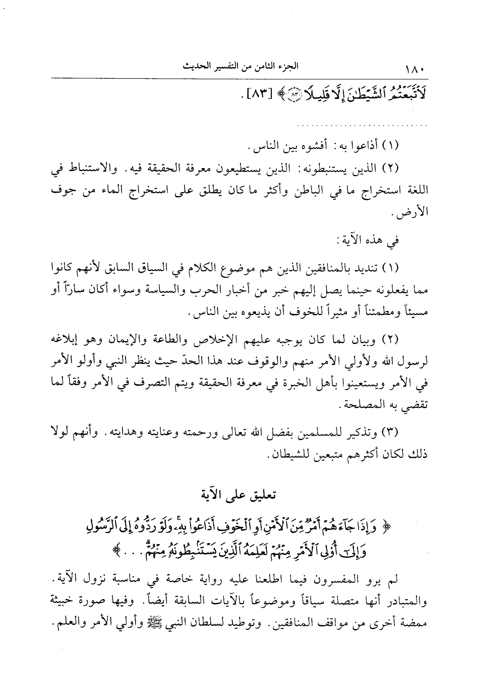 تعليق على الآية وَإِذا جاءَهُمْ أَمْرٌ مِنَ الْأَمْنِ أَوِ الْخَوْفِ أَذاعُوا بِهِ وَلَوْ رَدُّوهُ إِلَى الرَّسُولِ وَإِلى أُولِي الْأَمْرِ مِنْهُمْ لَعَلِمَهُ الَّذِينَ يَسْتَنْبِطُونَهُ مِنْهُمْ ...