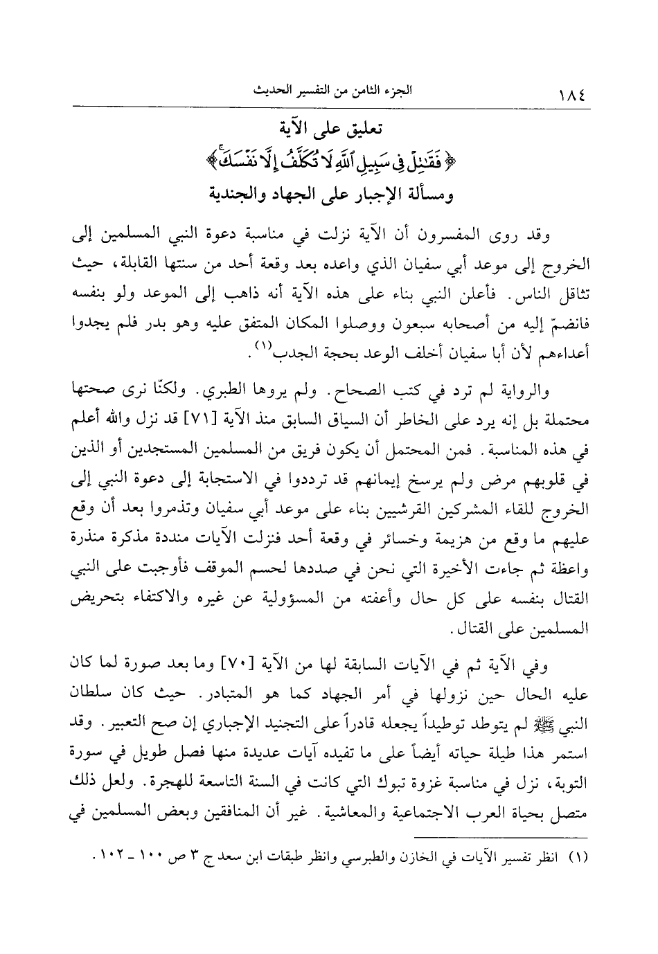 تعليق على الآية فَقاتِلْ فِي سَبِيلِ اللَّهِ لا تُكَلَّفُ إِلَّا نَفْسَكَ ومسألة الإجبار على الجهاد والجندية