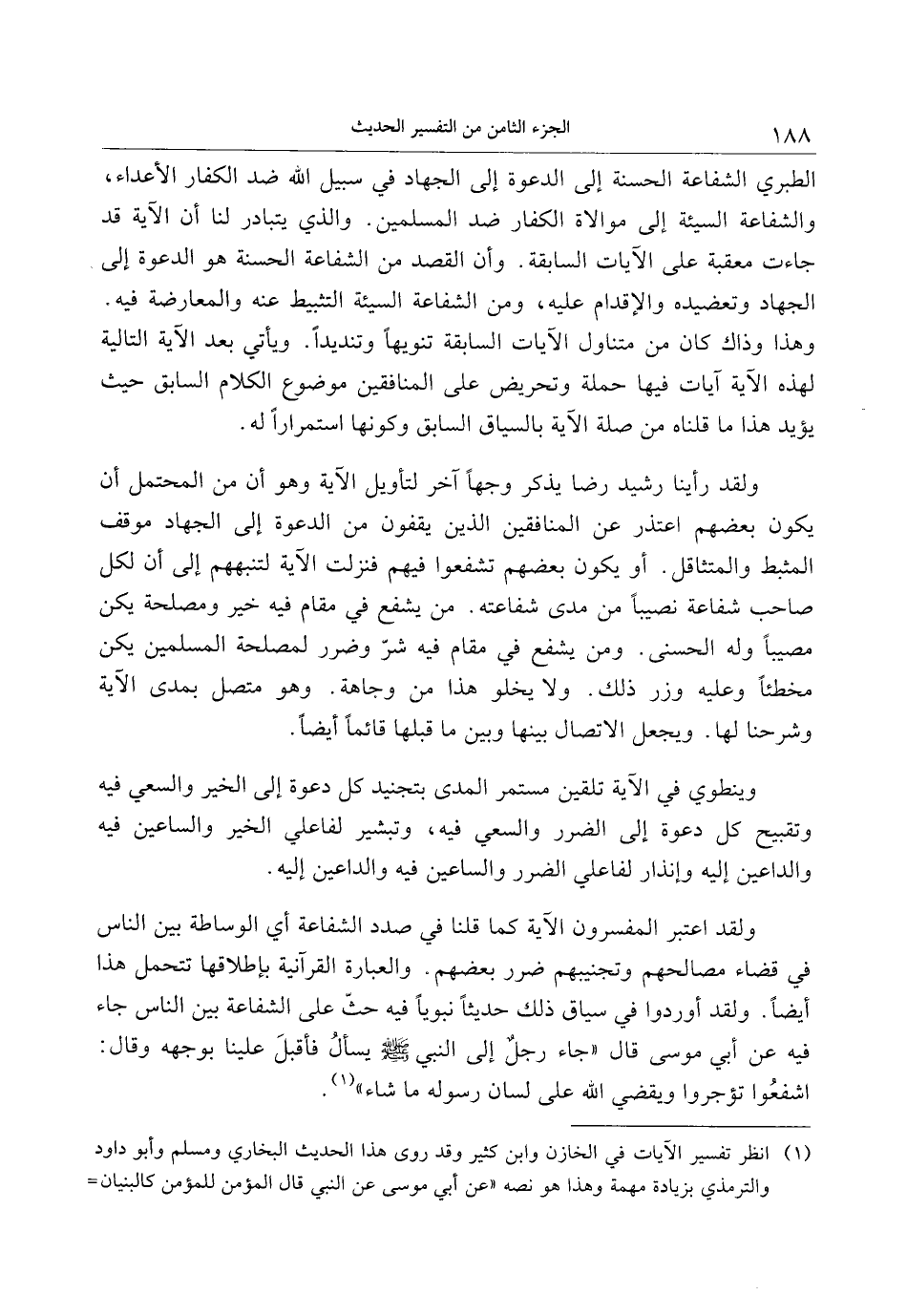 ولقد رأينا رشيد رضا يذكر وجها آخر لتأويل الآية وهو أن من المحتمل أن يكون بعضهم اعتذر عن المنافقين الذين يقفون من الدعوة إلى الجهاد موقف المثبط والمتثاقل. أو يكون بعضهم تشفعوا فيهم فنزلت الآية لتنبههم إلى أن لكل صاحب شفاعة نصيبا من مدى شفاعته. من يشفع في مقام فيه خير ومصلحة يكن مصيبا وله الحسنى. ومن يشفع في مقام فيه شرّ وضرر لمصلحة المسلمين يكن مخطئا وعليه وزر ذلك. ولا يخلو هذا من وجاهة. وهو متصل بمدى الآية وشرحنا لها. ويجعل الاتصال بينها وبين ما قبلها قائما أيضا.