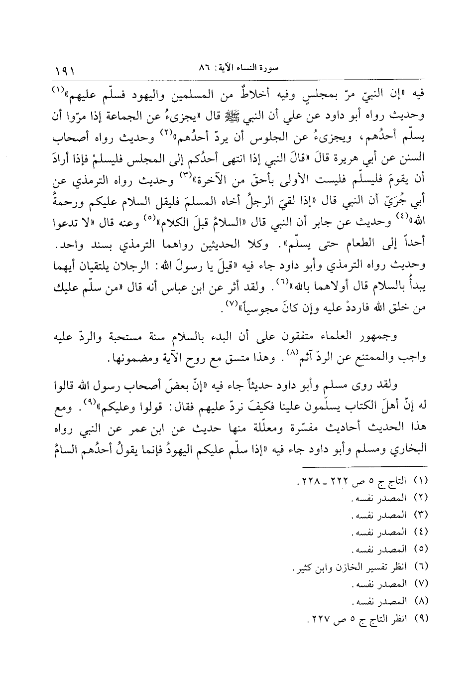 ولقد روى مسلم وأبو داود حديثا جاء فيه «إنّ بعض أصحاب رسول الله قالوا له إنّ أهل الكتاب يسلّمون علينا فكيف نردّ عليهم فقال: قولوا وعليكم» «9» . ومع هذا الحديث أحاديث مفسّرة ومعلّلة منها حديث عن ابن عمر عن النبي رواه البخاري ومسلم وأبو داود جاء فيه «إذا سلّم عليكم اليهود فإنما يقول أحدهم السام