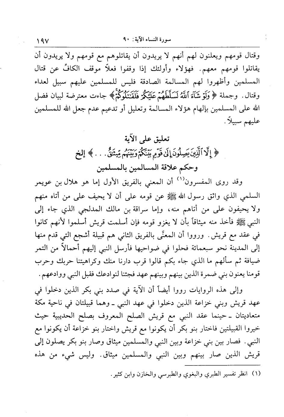 وقتال قومهم ويعلنون لهم أنهم لا يريدون أن يقاتلوهم مع قومهم ولا يريدون أن يقاتلوا قومهم معهم. فهؤلاء وأولئك إذا وقفوا فعلا موقف الكافّ عن قتال المسلمين وأظهروا لهم المسالمة الصادقة فليس للمسلمين عليهم سبيل لعداء وقتال. وجملة وَلَوْ شاءَ اللَّهُ لَسَلَّطَهُمْ عَلَيْكُمْ فَلَقاتَلُوكُمْ جاءت معترضة لبيان فضل الله على المسلمين بإلهام هؤلاء المسالمة وتعليل أو تدعيم عدم جعل الله للمسلمين عليهم سبيلا.