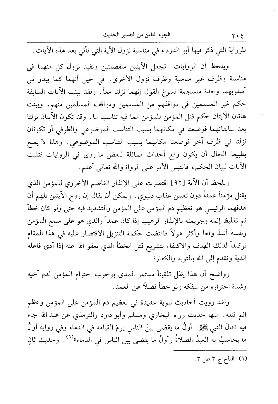 ويلحظ أن الآية [92] اقتصرت على الإنذار القاصم الأخروي للمؤمن الذي يقتل مؤمنا عمدا دون تعيين عقاب دنيوي. ويمكن أن يقال إن روح الآيتين تلهم أن هدفهما الرئيسي هو تعظيم دم المؤمن على المؤمن والتشديد فيه حتى ولو كان خطأ ثم تغليظ إثمه وجريمته بالإنذار الرهيب إذا كان عمدا والذي هو على سمع المؤمن ونفسه أشدّ وقعا وأكثر هولا فاقتضت حكمة التنزيل الاقتصار عليه في هذا المقام توكيدا لذلك الهدف والاكتفاء بتشريع قتل الخطأ الذي يعفو الله عنه إذا أدى فاعله الدية وتقدم إلى الله بالتوبة والكفارة.