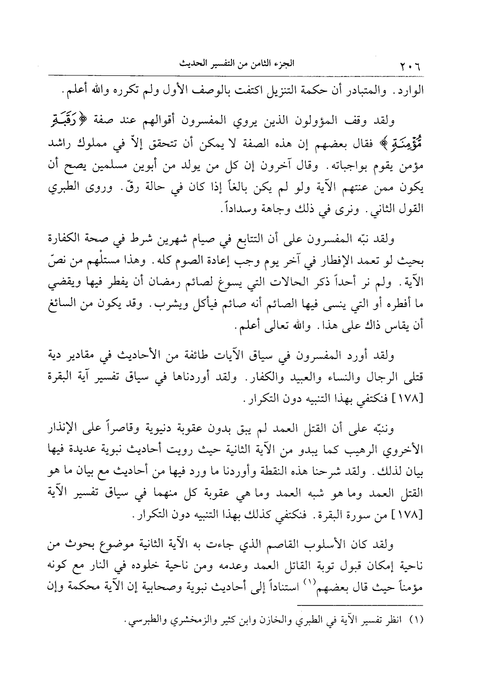 ولقد وقف المؤولون الذين يروي المفسرون أقوالهم عند صفة رَقَبَةٍ مُؤْمِنَةٍ فقال بعضهم إن هذه الصفة لا يمكن أن تتحقق إلّا في مملوك راشد مؤمن يقوم بواجباته. وقال آخرون إن كل من يولد من أبوين مسلمين يصح أن يكون ممن عنتهم الآية ولو لم يكن بالغا إذا كان في حالة رقّ. وروى الطبري القول الثاني. ونرى في ذلك وجاهة وسدادا.
