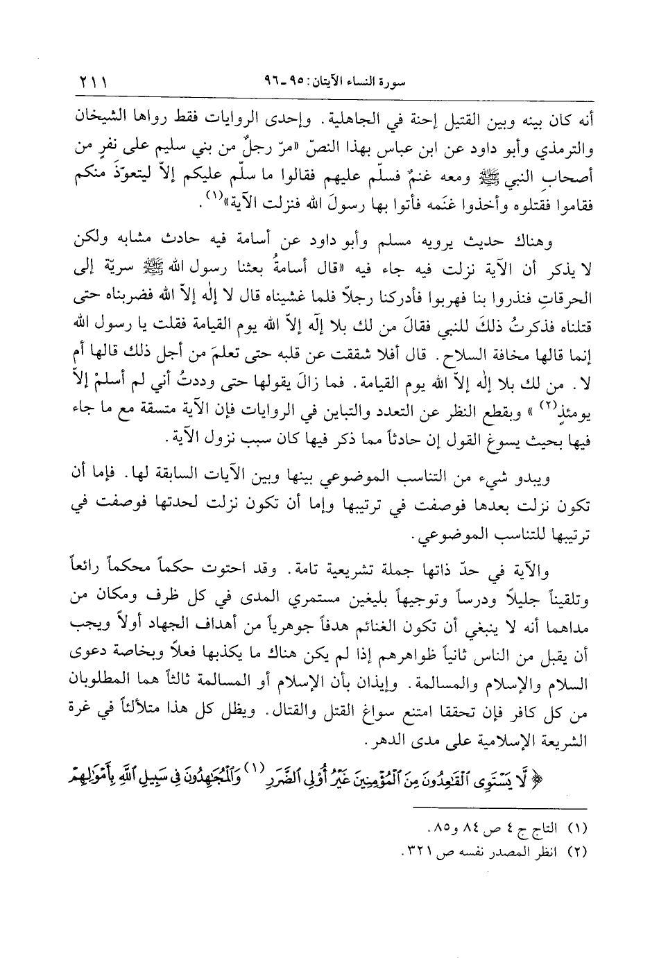 لا يَسْتَوِي الْقاعِدُونَ مِنَ الْمُؤْمِنِينَ غَيْرُ أُولِي الضَّرَرِ وَالْمُجاهِدُونَ فِي سَبِيلِ اللَّهِ بِأَمْوالِهِمْ وَأَنْفُسِهِمْ فَضَّلَ اللَّهُ الْمُجاهِدِينَ بِأَمْوالِهِمْ وَأَنْفُسِهِمْ عَلَى الْقاعِدِينَ دَرَجَةً وَكُلاًّ وَعَدَ اللَّهُ الْحُسْنى وَفَضَّلَ اللَّهُ الْمُجاهِدِينَ عَلَى الْقاعِدِينَ أَجْراً عَظِيماً (95) دَرَجاتٍ مِنْهُ وَمَغْفِرَةً وَرَحْمَةً وَكانَ اللَّهُ غَفُوراً رَحِيماً (96) .
