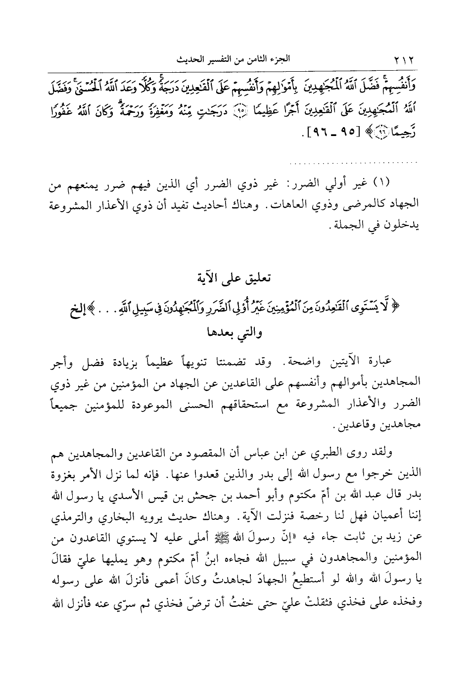 تعليق على الآية لا يَسْتَوِي الْقاعِدُونَ مِنَ الْمُؤْمِنِينَ غَيْرُ أُولِي الضَّرَرِ وَالْمُجاهِدُونَ فِي سَبِيلِ اللَّهِ ... إلخ والتي بعدها
