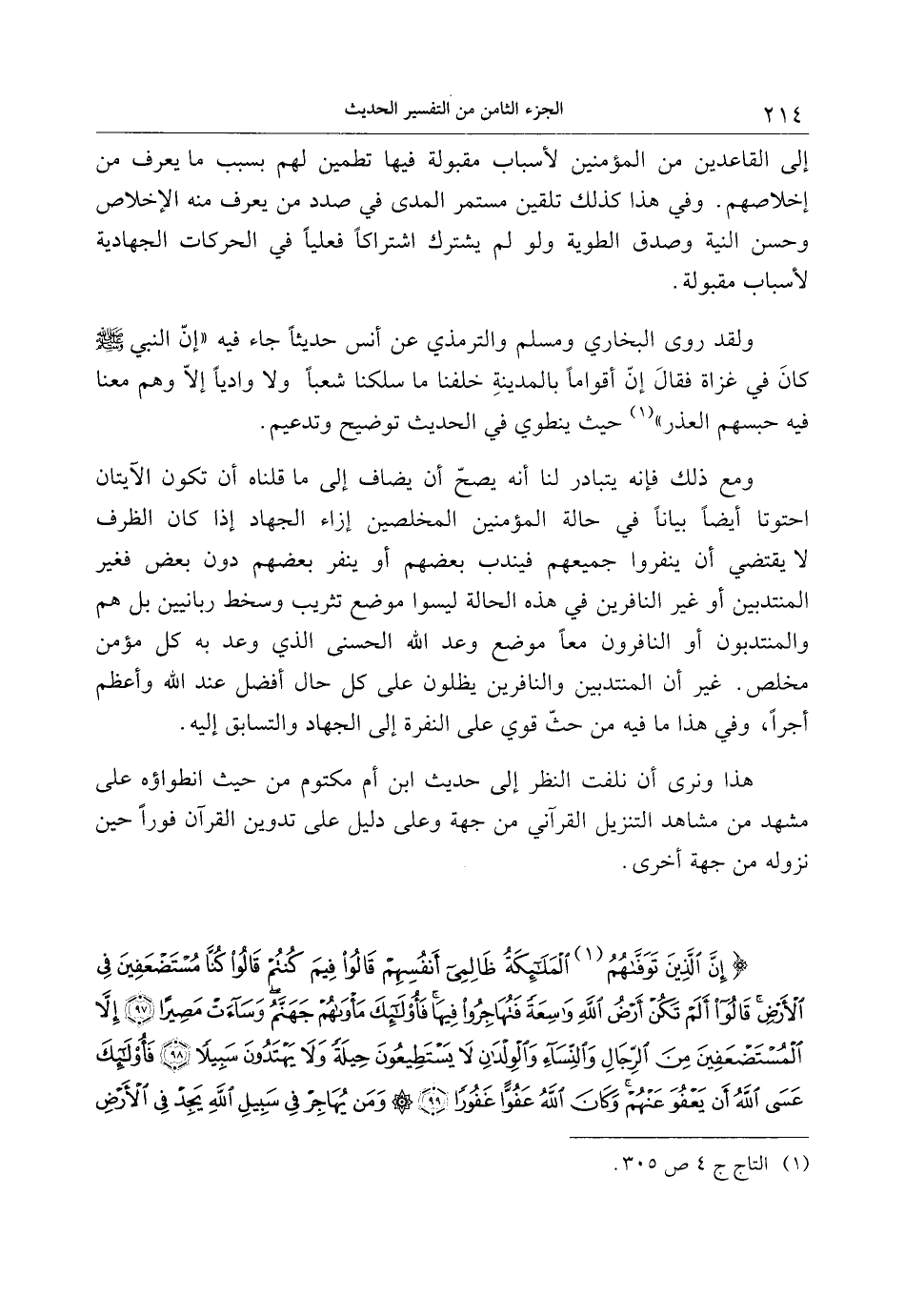 ولقد روى البخاري ومسلم والترمذي عن أنس حديثا جاء فيه «إنّ النبي صلى الله عليه وسلم كان في غزاة فقال إنّ أقواما بالمدينة خلفنا ما سلكنا شعبا ولا واديا إلّا وهم معنا فيه حبسهم العذر» «1» حيث ينطوي في الحديث توضيح وتدعيم.
