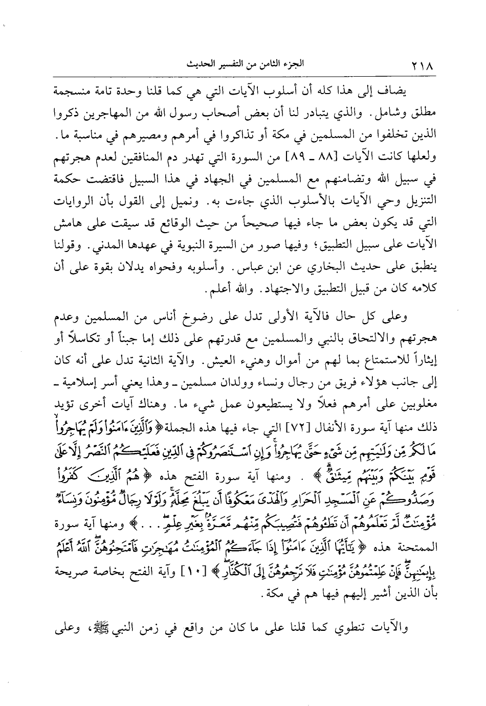 وعلى كل حال فالآية الأولى تدل على رضوخ أناس من المسلمين وعدم هجرتهم والالتحاق بالنبي والمسلمين مع قدرتهم على ذلك إما جبنا أو تكاسلا أو إيثارا للاستمتاع بما لهم من أموال وهنيء العيش. والآية الثانية تدل على أنه كان إلى جانب هؤلاء فريق من رجال ونساء وولدان مسلمين- وهذا يعني أسر إسلامية- مغلوبين على أمرهم فعلا ولا يستطيعون عمل شيء ما. وهناك آيات أخرى تؤيد ذلك منها آية سورة الأنفال [72] التي جاء فيها هذه الجملة وَالَّذِينَ آمَنُوا وَلَمْ يُهاجِرُوا ما لَكُمْ مِنْ وَلايَتِهِمْ مِنْ شَيْءٍ حَتَّى يُهاجِرُوا وَإِنِ اسْتَنْصَرُوكُمْ فِي الدِّينِ فَعَلَيْكُمُ النَّصْرُ إِلَّا عَلى قَوْمٍ بَيْنَكُمْ وَبَيْنَهُمْ مِيثاقٌ. ومنها آية سورة الفتح هذه هُمُ الَّذِينَ كَفَرُوا وَصَدُّوكُمْ عَنِ الْمَسْجِدِ الْحَرامِ وَالْهَدْيَ مَعْكُوفاً أَنْ يَبْلُغَ مَحِلَّهُ وَلَوْلا رِجالٌ مُؤْمِنُونَ وَنِساءٌ مُؤْمِناتٌ لَمْ تَعْلَمُوهُمْ أَنْ تَطَؤُهُمْ فَتُصِيبَكُمْ مِنْهُمْ مَعَرَّةٌ بِغَيْرِ عِلْمٍ ... ومنها آية سورة الممتحنة هذه يا أَيُّهَا الَّذِينَ آمَنُوا إِذا جاءَكُمُ الْمُؤْمِناتُ مُهاجِراتٍ فَامْتَحِنُوهُنَّ اللَّهُ أَعْلَمُ بِإِيمانِهِنَّ فَإِنْ عَلِمْتُمُوهُنَّ مُؤْمِناتٍ فَلا تَرْجِعُوهُنَّ إِلَى الْكُفَّارِ [10] وآية الفتح بخاصة صريحة بأن الذين أشير إليهم فيها هم في مكة.