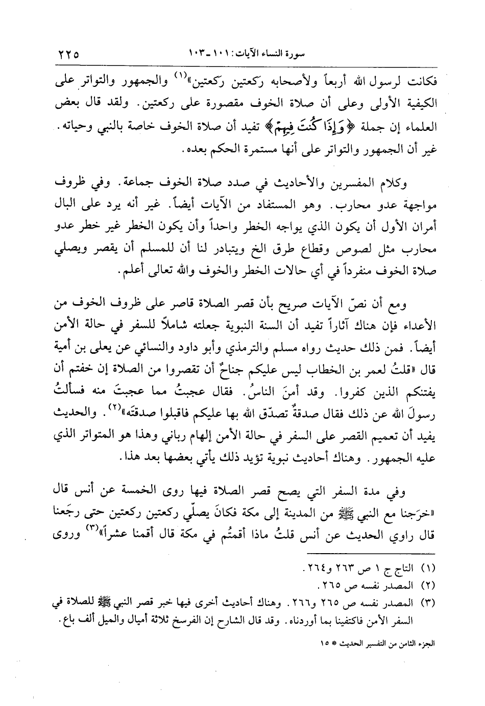 ومع أن نصّ الآيات صريح بأن قصر الصلاة قاصر على ظروف الخوف من الأعداء فإن هناك آثارا تفيد أن السنة النبوية جعلته شاملا للسفر في حالة الأمن أيضا. فمن ذلك حديث رواه مسلم والترمذي وأبو داود والنسائي عن يعلى بن أمية قال «قلت لعمر بن الخطاب ليس عليكم جناح أن تقصروا من الصلاة إن خفتم أن يفتنكم الذين كفروا. وقد أمن الناس. فقال عجبت مما عجبت منه فسألت رسول الله عن ذلك فقال صدقة تصدّق الله بها عليكم فاقبلوا صدقته» «2» . والحديث يفيد أن تعميم القصر على السفر في حالة الأمن إلهام رباني وهذا هو المتواتر الذي عليه الجمهور. وهناك أحاديث نبوية تؤيد ذلك يأتي بعضها بعد هذا.