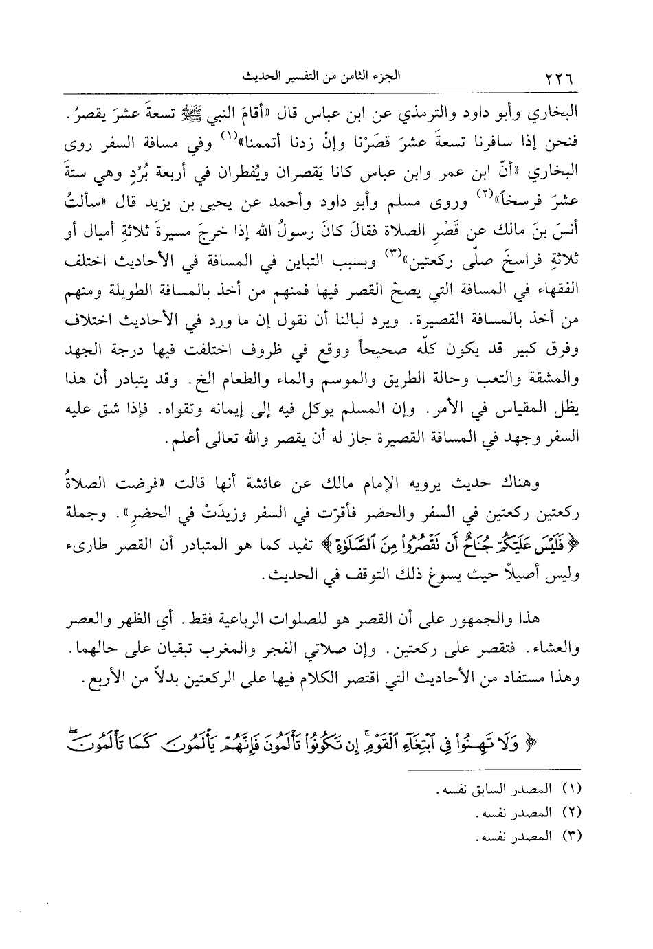 وبسبب التباين في المسافة في الأحاديث اختلف الفقهاء في المسافة التي يصحّ القصر فيها فمنهم من أخذ بالمسافة الطويلة ومنهم من أخذ بالمسافة القصيرة. ويرد لبالنا أن نقول إن ما ورد في الأحاديث اختلاف وفرق كبير قد يكون كلّه صحيحا ووقع في ظروف اختلفت فيها درجة الجهد والمشقة والتعب وحالة الطريق والموسم والماء والطعام إلخ. وقد يتبادر أن هذا يظل المقياس في الأمر. وإن المسلم يوكل فيه إلى إيمانه وتقواه. فإذا شق عليه السفر وجهد في المسافة القصيرة جاز له أن يقصر والله تعالى أعلم.