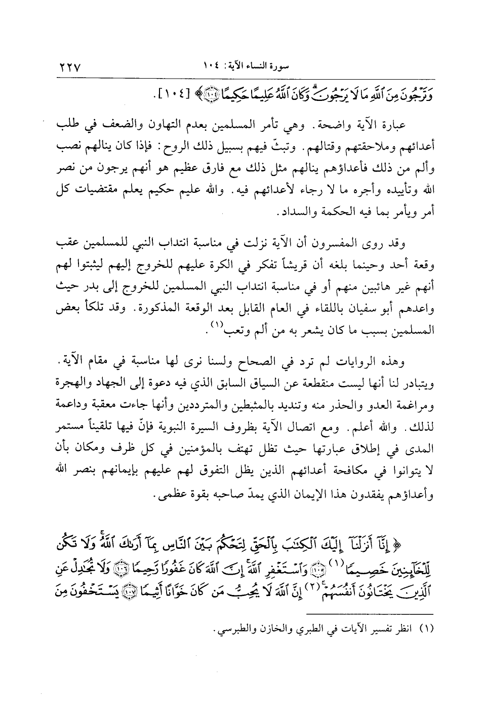 عبارة الآية واضحة. وهي تأمر المسلمين بعدم التهاون والضعف في طلب أعدائهم وملاحقتهم وقتالهم. وتبثّ فيهم بسبيل ذلك الروح: فإذا كان ينالهم نصب وألم من ذلك فأعداؤهم ينالهم مثل ذلك مع فارق عظيم هو أنهم يرجون من نصر الله وتأييده وأجره ما لا رجاء لأعدائهم فيه. والله عليم حكيم يعلم مقتضيات كل أمر ويأمر بما فيه الحكمة والسداد.