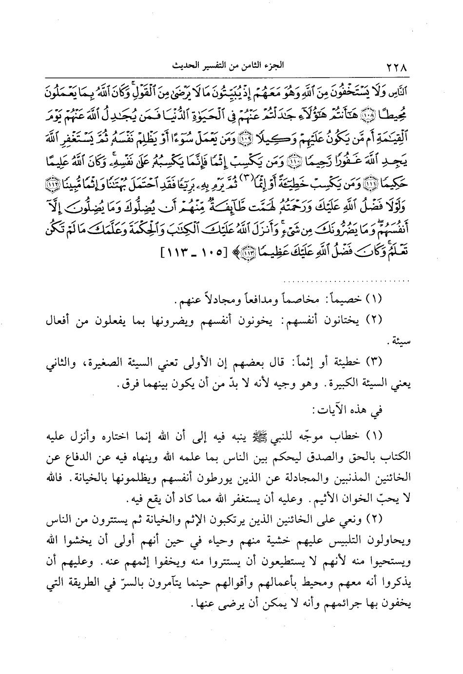 (1) خطاب موجّه للنبي صلى الله عليه وسلم ينبه فيه إلى أن الله إنما اختاره وأنزل عليه الكتاب بالحق والصدق ليحكم بين الناس بما علمه الله وينهاه فيه عن الدفاع عن الخائنين المذنبين والمجادلة عن الذين يورطون أنفسهم ويظلمونها بالخيانة. فالله لا يحبّ الخوان الأثيم. وعليه أن يستغفر الله مما كاد أن يقع فيه.