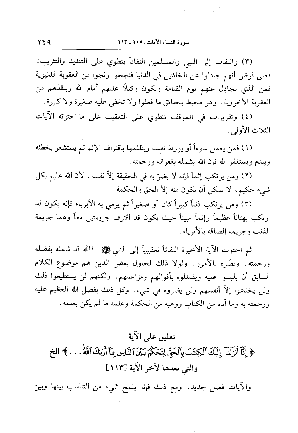 تعليق على الآية إِنَّا أَنْزَلْنا إِلَيْكَ الْكِتابَ بِالْحَقِّ لِتَحْكُمَ بَيْنَ النَّاسِ بِما أَراكَ اللَّهُ ... إلخ والتي بعدها لآخر الآية [113]