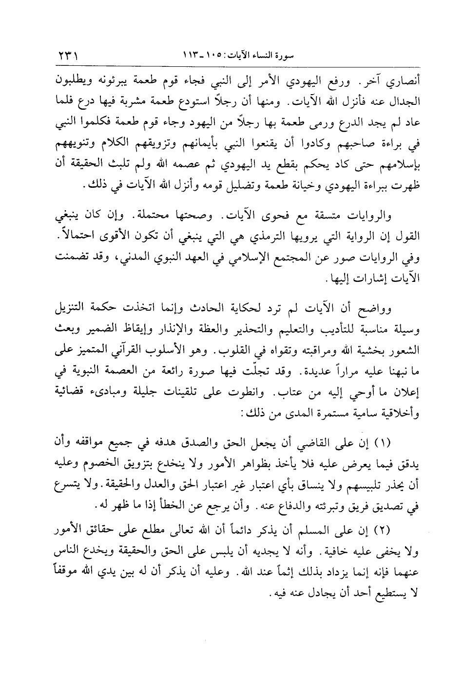 أنصاري آخر. ورفع اليهودي الأمر إلى النبي فجاء قوم طعمة يبرئونه ويطلبون الجدال عنه فأنزل الله الآيات. ومنها أن رجلا استودع طعمة مشربة فيها درع فلما عاد لم يجد الدرع ورمى طعمة بها رجلا من اليهود وجاء قوم طعمة فكلموا النبي في براءة صاحبهم وكادوا أن يقنعوا النبي بأيمانهم وتزويقهم الكلام وتنويههم بإسلامهم حتى كاد يحكم بقطع يد اليهودي ثم عصمه الله ولم تلبث الحقيقة أن ظهرت ببراءة اليهودي وخيانة طعمة وتضليل قومه وأنزل الله الآيات في ذلك.