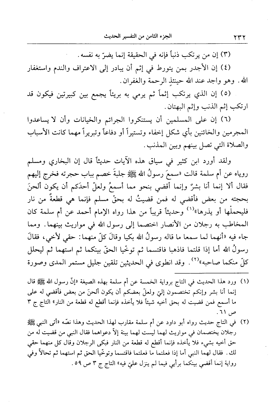 (1) ورد هذا الحديث في التاج برواية الخمسة عن أم سلمة بهذه الصيغة «إنّ رسول الله صلى الله عليه وسلم قال إنما أنا بشر وإنكم تختصمون إليّ ولعلّ بعضكم أن يكون ألحن من بعض فأقضي له على ما أسمع فمن قضيت له بحق أخيه شيئا فلا يأخذه فإنما أقطع له قطعة من النار» التاج ج 3 ص 61.