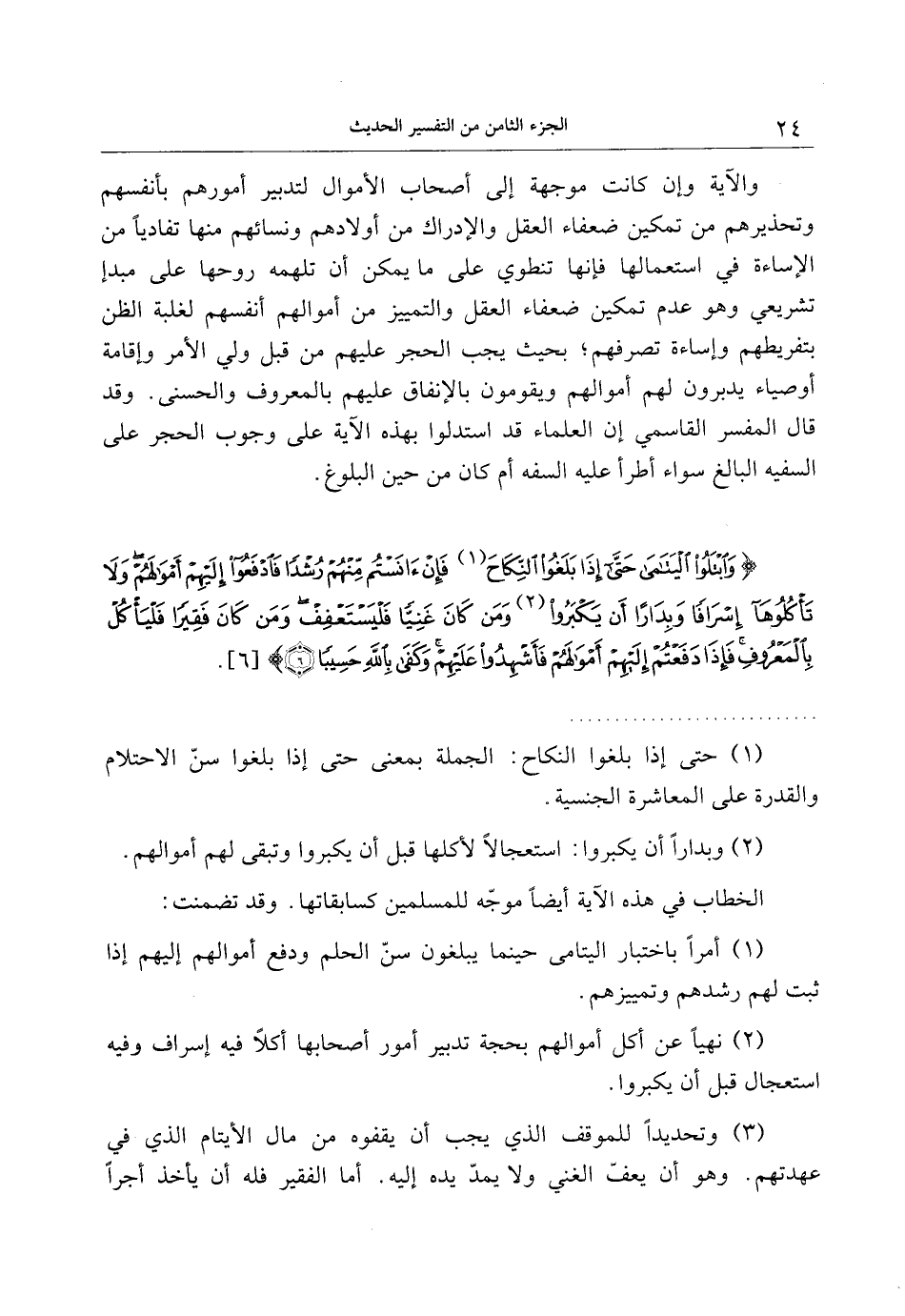(3) وتحديدا للموقف الذي يجب أن يقفوه من مال الأيتام الذي في عهدتهم. وهو أن يعفّ الغني ولا يمدّ يده إليه. أما الفقير فله أن يأخذ أجرا
