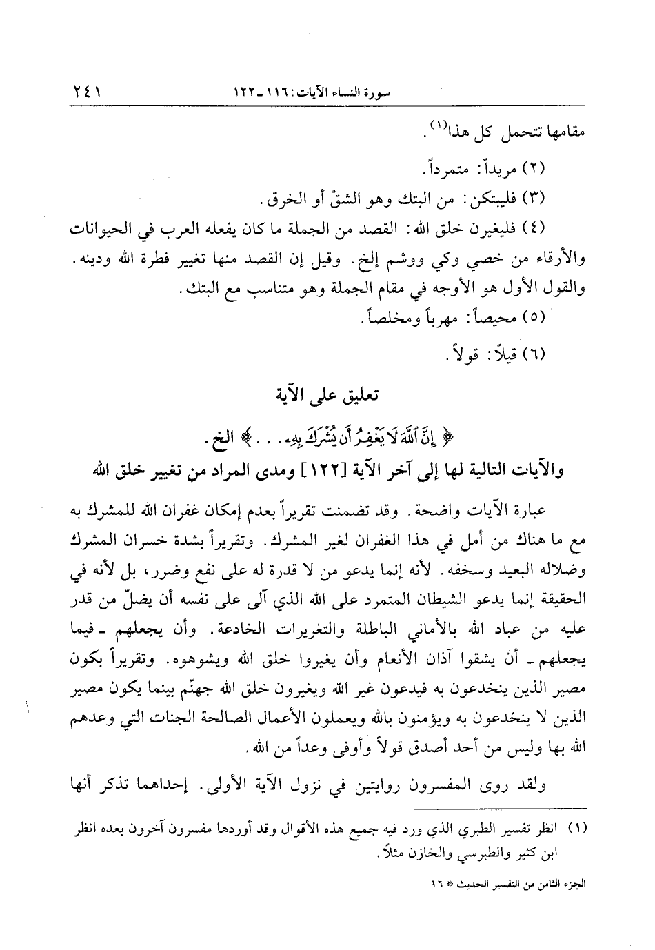 تعليق على الآية إِنَّ اللَّهَ لا يَغْفِرُ أَنْ يُشْرَكَ بِهِ ... إلخ. والآيات التالية لها إلى آخر الآية [122] ومدى المراد من تغيير خلق الله