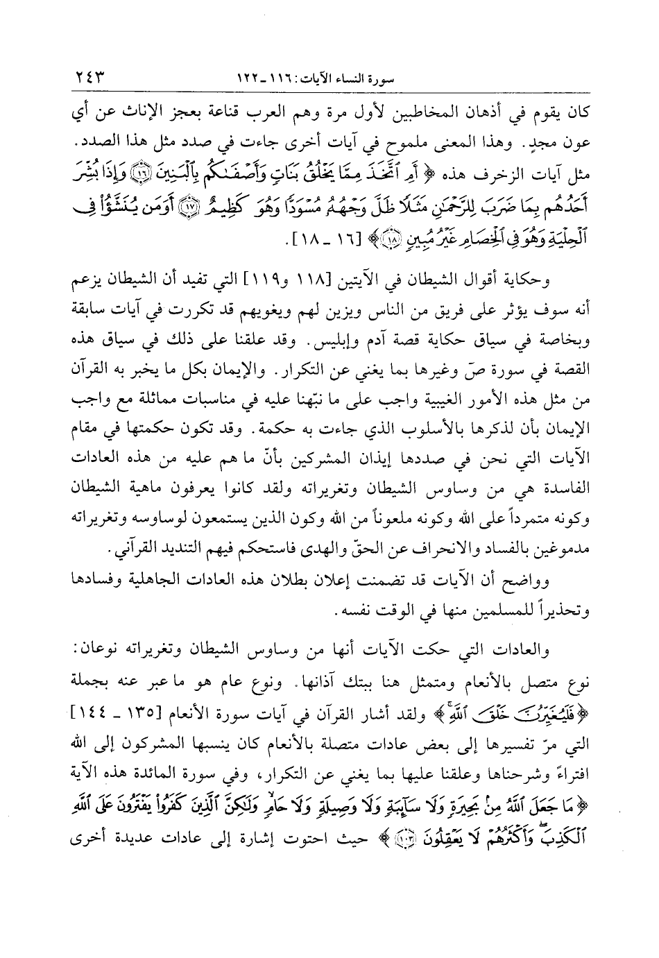 وحكاية أقوال الشيطان في الآيتين [118 و 119] التي تفيد أن الشيطان يزعم أنه سوف يؤثر على فريق من الناس ويزين لهم ويغويهم قد تكررت في آيات سابقة وبخاصة في سياق حكاية قصة آدم وإبليس. وقد علقنا على ذلك في سياق هذه القصة في سورة ص وغيرها بما يغني عن التكرار. والإيمان بكل ما يخبر به القرآن من مثل هذه الأمور الغيبية واجب على ما نبّهنا عليه في مناسبات مماثلة مع واجب الإيمان بأن لذكرها بالأسلوب الذي جاءت به حكمة. وقد تكون حكمتها في مقام الآيات التي نحن في صددها إيذان المشركين بأنّ ما هم عليه من هذه العادات الفاسدة هي من وساوس الشيطان وتغريراته ولقد كانوا يعرفون ماهية الشيطان وكونه متمردا على الله وكونه ملعونا من الله وكون الذين يستمعون لوساوسه وتغريراته مدموغين بالفساد والانحراف عن الحقّ والهدى فاستحكم فيهم التنديد القرآني.