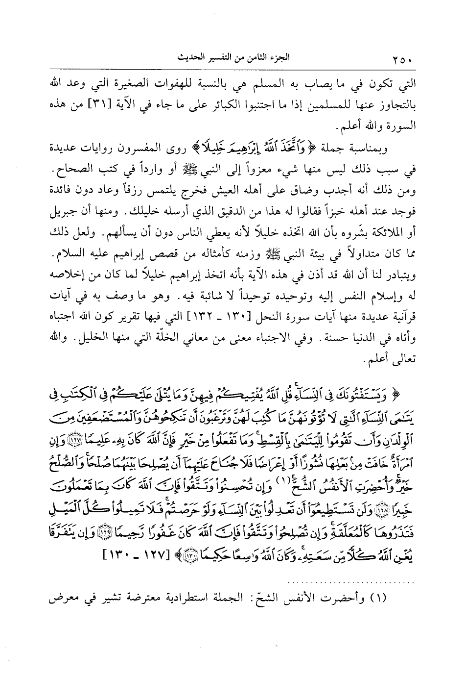 ويتبادر لنا أن الله قد أذن في هذه الآية بأنه اتخذ إبراهيم خليلا لما كان من إخلاصه له وإسلام النفس إليه وتوحيده توحيدا لا شائبة فيه. وهو ما وصف به في آيات قرآنية عديدة منها آيات سورة النحل [130- 132] التي فيها تقرير كون الله اجتباه وأتاه في الدنيا حسنة. وفي الاجتباء معنى من معاني الخلّة التي منها الخليل. والله تعالى أعلم.