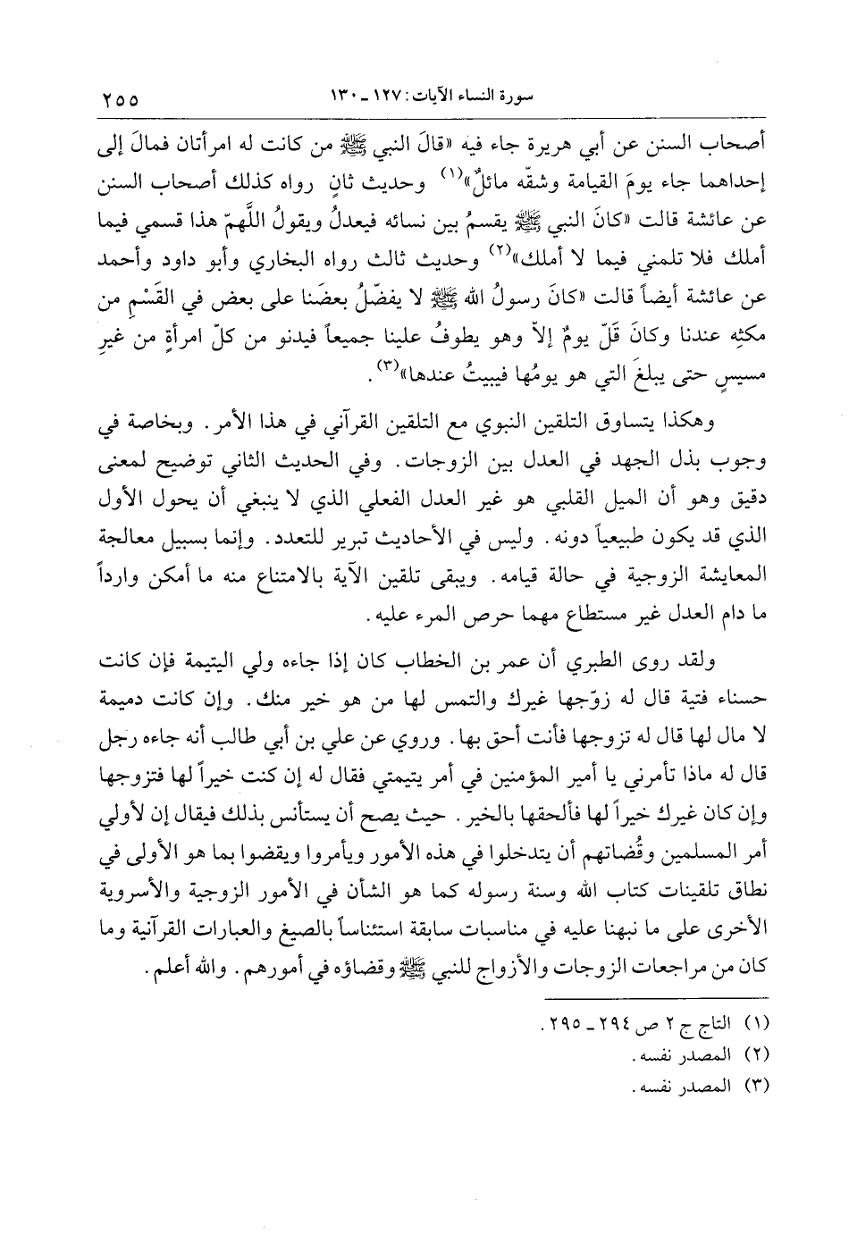 أصحاب السنن عن أبي هريرة جاء فيه «قال النبي صلى الله عليه وسلم من كانت له امرأتان فمال إلى إحداهما جاء يوم القيامة وشقّه مائل» «1» وحديث ثان رواه كذلك أصحاب السنن عن عائشة قالت «كان النبي صلى الله عليه وسلم يقسم بين نسائه فيعدل ويقول اللهمّ هذا قسمي فيما أملك فلا تلمني فيما لا أملك» «2» وحديث ثالث رواه البخاري وأبو داود وأحمد عن عائشة أيضا قالت «كان رسول الله صلى الله عليه وسلم لا يفضّل بعضنا على بعض في القسم من مكثه عندنا وكان قلّ يوم إلّا وهو يطوف علينا جميعا فيدنو من كلّ امرأة من غير مسيس حتى يبلغ التي هو يومها فيبيت عندها» «3» .