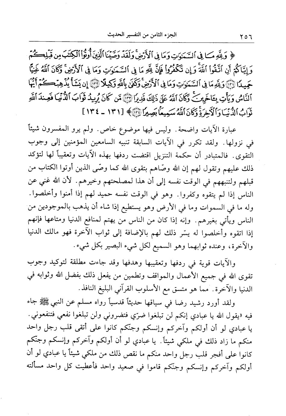 وَلِلَّهِ ما فِي السَّماواتِ وَما فِي الْأَرْضِ وَلَقَدْ وَصَّيْنَا الَّذِينَ أُوتُوا الْكِتابَ مِنْ قَبْلِكُمْ وَإِيَّاكُمْ أَنِ اتَّقُوا اللَّهَ وَإِنْ تَكْفُرُوا فَإِنَّ لِلَّهِ ما فِي السَّماواتِ وَما فِي الْأَرْضِ وَكانَ اللَّهُ غَنِيًّا حَمِيداً (131) وَلِلَّهِ ما فِي السَّماواتِ وَما فِي الْأَرْضِ وَكَفى بِاللَّهِ وَكِيلاً (132) إِنْ يَشَأْ يُذْهِبْكُمْ أَيُّهَا النَّاسُ وَيَأْتِ بِآخَرِينَ وَكانَ اللَّهُ عَلى ذلِكَ قَدِيراً (133) مَنْ كانَ يُرِيدُ ثَوابَ الدُّنْيا فَعِنْدَ اللَّهِ ثَوابُ الدُّنْيا وَالْآخِرَةِ وَكانَ اللَّهُ سَمِيعاً بَصِيراً (134)