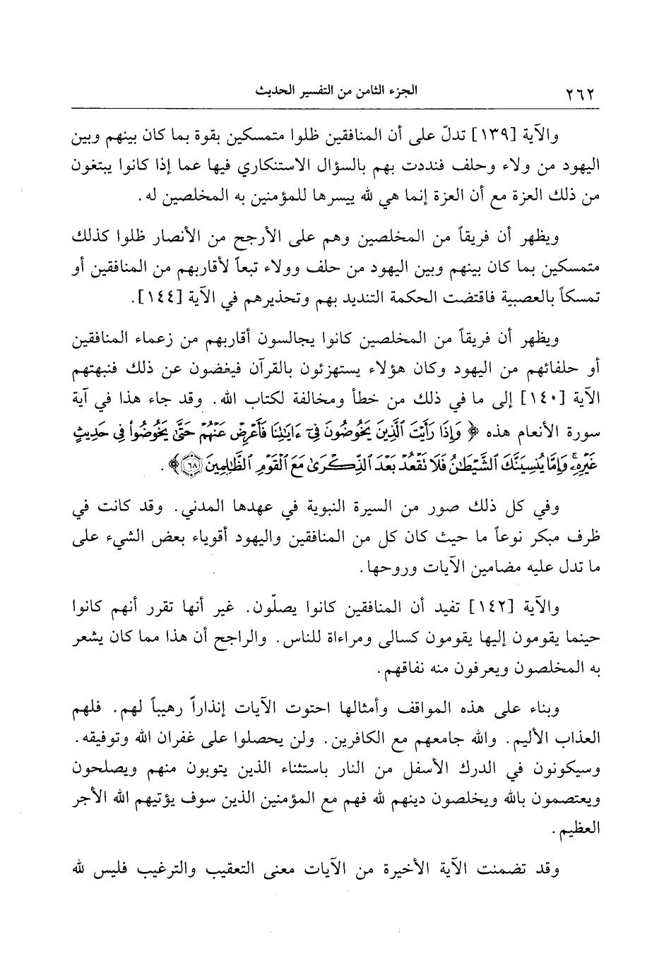 ويظهر أن فريقا من المخلصين وهم على الأرجح من الأنصار ظلوا كذلك متمسكين بما كان بينهم وبين اليهود من حلف وولاء تبعا لأقاربهم من المنافقين أو تمسكا بالعصبية فاقتضت الحكمة التنديد بهم وتحذيرهم في الآية [144] .