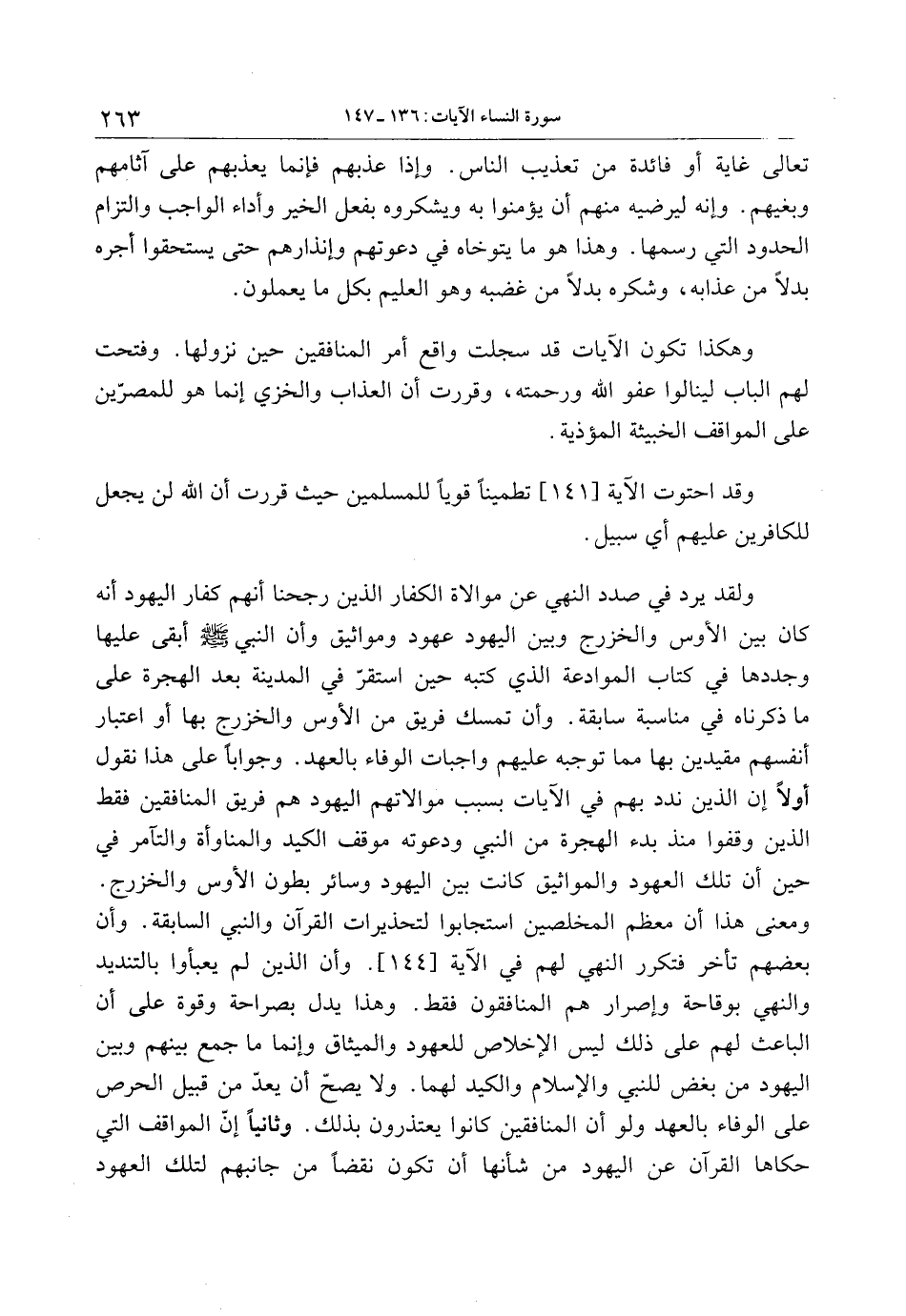 ومعنى هذا أن معظم المخلصين استجابوا لتحذيرات القرآن والنبي السابقة. وأن بعضهم تأخر فتكرر النهي لهم في الآية [144] . وأن الذين لم يعبأوا بالتنديد والنهي بوقاحة وإصرار هم المنافقون فقط. وهذا يدل بصراحة وقوة على أن الباعث لهم على ذلك ليس الإخلاص للعهود والميثاق وإنما ما جمع بينهم وبين اليهود من بغض للنبي والإسلام والكيد لهما. ولا يصحّ أن يعدّ من قبيل الحرص على الوفاء بالعهد ولو أن المنافقين كانوا يعتذرون بذلك. وثانيا إنّ المواقف التي حكاها القرآن عن اليهود من شأنها أن تكون نقضا من جانبهم لتلك العهود