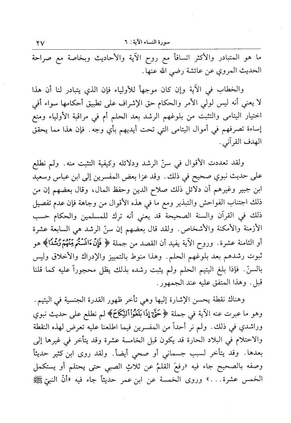 ولقد تعددت الأقوال في سنّ الرشد ودلائله وكيفية التثبت منه. ولم نطلع على حديث نبوي صحيح في ذلك. وقد عزا بعض المفسرين إلى ابن عباس وسعيد ابن جبير وغيرهم أن دلائل ذلك صلاح الدين وحفظ المال، وقال بعضهم إن من ذلك اجتناب الفواحش والتبذير ومع ما في هذه الأقوال من وجاهة فإن عدم تفصيل ذلك في القرآن والسنة الصحيحة قد يعني أنه ترك للمسلمين والحكام حسب الأزمنة والأمكنة والأشخاص. ولقد قال بعضهم إن سنّ الرشد هي السابعة عشرة أو الثامنة عشرة. وروح الآية يفيد أن القصد من جملة فَإِنْ آنَسْتُمْ مِنْهُمْ رُشْداً هو ثبوت رشدهم بعد بلوغهم الحلم. وهذا منوط بالتمييز والإدراك والأخلاق وليس بالسنّ. فإذا بلغ اليتيم الحلم ولم يثبت رشده بذلك يظل محجورا عليه كما قلنا قبل. وهذا المتفق عليه عند الجمهور.