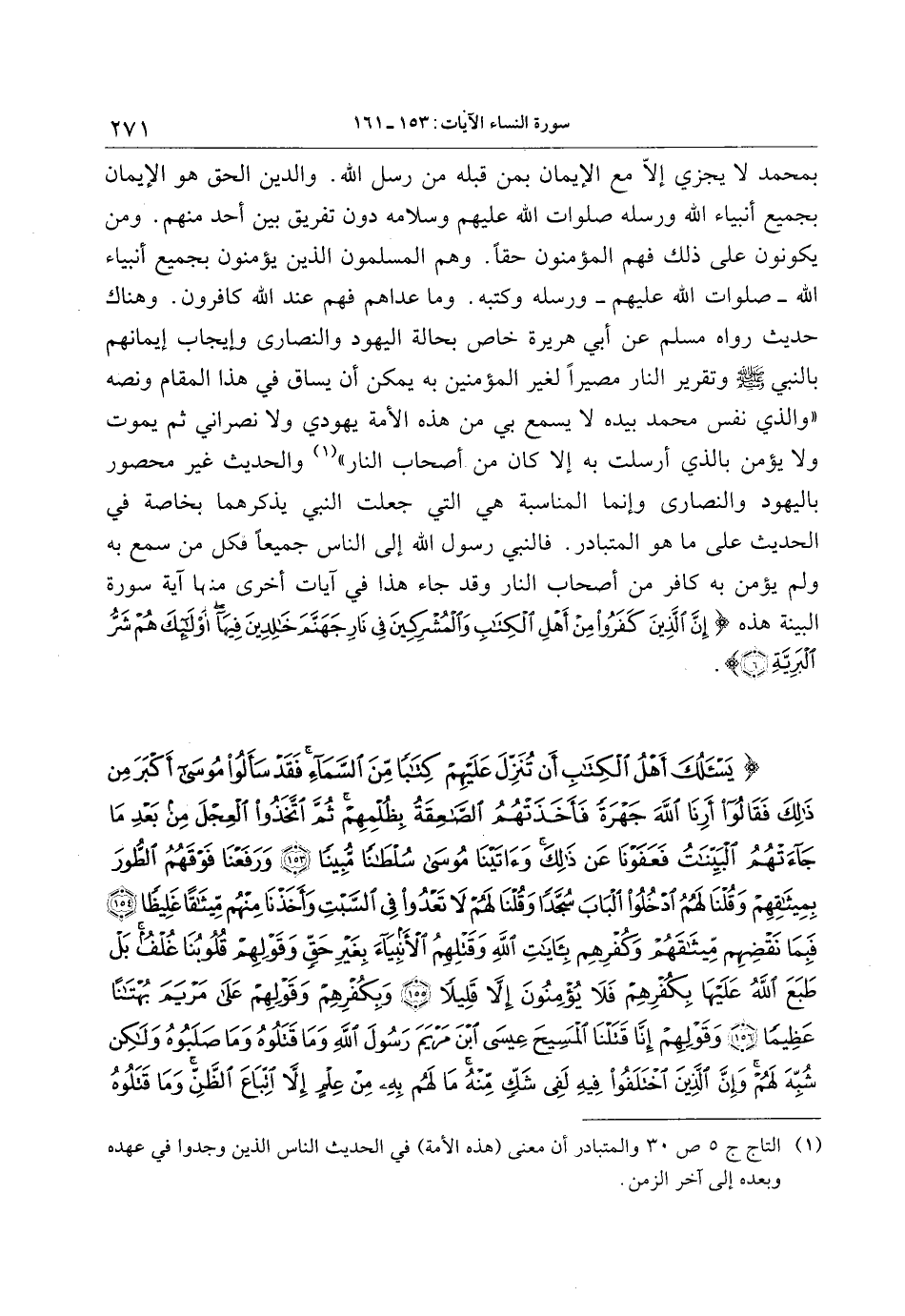بمحمد لا يجزي إلّا مع الإيمان بمن قبله من رسل الله. والدين الحق هو الإيمان بجميع أنبياء الله ورسله صلوات الله عليهم وسلامه دون تفريق بين أحد منهم. ومن يكونون على ذلك فهم المؤمنون حقا. وهم المسلمون الذين يؤمنون بجميع أنبياء الله- صلوات الله عليهم- ورسله وكتبه. وما عداهم فهم عند الله كافرون. وهناك حديث رواه مسلم عن أبي هريرة خاص بحالة اليهود والنصارى وإيجاب إيمانهم بالنبي صلى الله عليه وسلم وتقرير النار مصيرا لغير المؤمنين به يمكن أن يساق في هذا المقام ونصه «والذي نفس محمد بيده لا يسمع بي من هذه الأمة يهودي ولا نصراني ثم يموت ولا يؤمن بالذي أرسلت به إلا كان من أصحاب النار» «1» والحديث غير محصور باليهود والنصارى وإنما المناسبة هي التي جعلت النبي يذكرهما بخاصة في الحديث على ما هو المتبادر. فالنبي رسول الله إلى الناس جميعا فكل من سمع به ولم يؤمن به كافر من أصحاب النار وقد جاء هذا في آيات أخرى منها آية سورة البينة هذه إِنَّ الَّذِينَ كَفَرُوا مِنْ أَهْلِ الْكِتابِ وَالْمُشْرِكِينَ فِي نارِ جَهَنَّمَ خالِدِينَ فِيها أُولئِكَ هُمْ شَرُّ الْبَرِيَّةِ (6) .