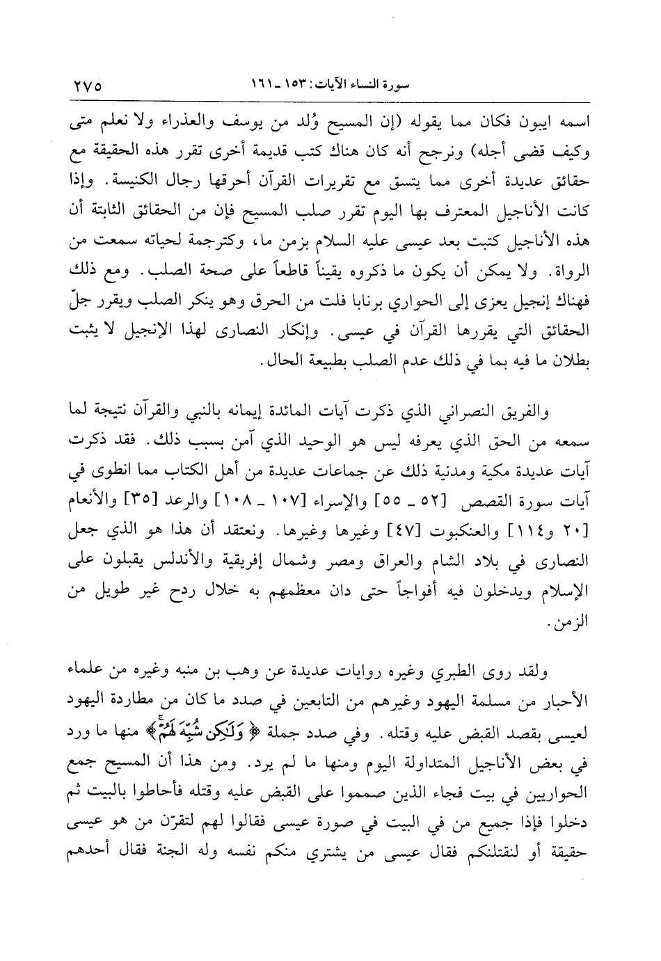 اسمه ايبون فكان مما يقوله (إن المسيح ولد من يوسف والعذراء ولا نعلم متى وكيف قضى أجله) ونرجح أنه كان هناك كتب قديمة أخرى تقرر هذه الحقيقة مع حقائق عديدة أخرى مما يتسق مع تقريرات القرآن أحرقها رجال الكنيسة. وإذا كانت الأناجيل المعترف بها اليوم تقرر صلب المسيح فإن من الحقائق الثابتة أن هذه الأناجيل كتبت بعد عيسى عليه السلام بزمن ما، وكترجمة لحياته سمعت من الرواة. ولا يمكن أن يكون ما ذكروه يقينا قاطعا على صحة الصلب. ومع ذلك فهناك إنجيل يعزى إلى الحواري برنابا فلت من الحرق وهو ينكر الصلب ويقرر جلّ الحقائق التي يقررها القرآن في عيسى. وإنكار النصارى لهذا الإنجيل لا يثبت بطلان ما فيه بما في ذلك عدم الصلب بطبيعة الحال.