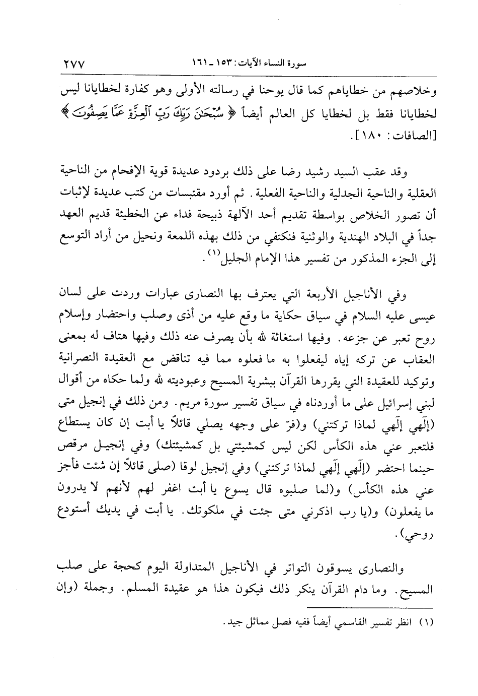 وقد عقب السيد رشيد رضا على ذلك بردود عديدة قوية الإفحام من الناحية العقلية والناحية الجدلية والناحية الفعلية. ثم أورد مقتبسات من كتب عديدة لإثبات أن تصور الخلاص بواسطة تقديم أحد الآلهة ذبيحة فداء عن الخطيئة قديم العهد جدا في البلاد الهندية والوثنية فنكتفي من ذلك بهذه اللمعة ونحيل من أراد التوسع إلى الجزء المذكور من تفسير هذا الإمام الجليل «1» .