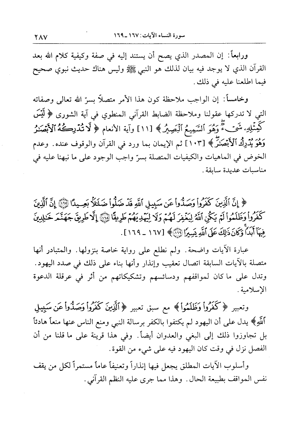 إِنَّ الَّذِينَ كَفَرُوا وَصَدُّوا عَنْ سَبِيلِ اللَّهِ قَدْ ضَلُّوا ضَلالاً بَعِيداً (167) إِنَّ الَّذِينَ كَفَرُوا وَظَلَمُوا لَمْ يَكُنِ اللَّهُ لِيَغْفِرَ لَهُمْ وَلا لِيَهْدِيَهُمْ طَرِيقاً (168) إِلاَّ طَرِيقَ جَهَنَّمَ خالِدِينَ فِيها أَبَداً وَكانَ ذلِكَ عَلَى اللَّهِ يَسِيراً (169)