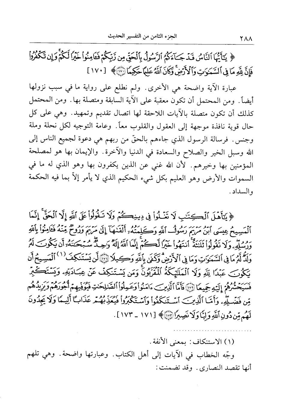 يا أَهْلَ الْكِتابِ لا تَغْلُوا فِي دِينِكُمْ وَلا تَقُولُوا عَلَى اللَّهِ إِلاَّ الْحَقَّ إِنَّمَا الْمَسِيحُ عِيسَى ابْنُ مَرْيَمَ رَسُولُ اللَّهِ وَكَلِمَتُهُ أَلْقاها إِلى مَرْيَمَ وَرُوحٌ مِنْهُ فَآمِنُوا بِاللَّهِ وَرُسُلِهِ وَلا تَقُولُوا ثَلاثَةٌ انْتَهُوا خَيْراً لَكُمْ إِنَّمَا اللَّهُ إِلهٌ واحِدٌ سُبْحانَهُ أَنْ يَكُونَ لَهُ وَلَدٌ لَهُ ما فِي السَّماواتِ وَما فِي الْأَرْضِ وَكَفى بِاللَّهِ وَكِيلاً (171) لَنْ يَسْتَنْكِفَ الْمَسِيحُ أَنْ يَكُونَ عَبْداً لِلَّهِ وَلا الْمَلائِكَةُ الْمُقَرَّبُونَ وَمَنْ يَسْتَنْكِفْ عَنْ عِبادَتِهِ وَيَسْتَكْبِرْ فَسَيَحْشُرُهُمْ إِلَيْهِ جَمِيعاً (172) فَأَمَّا الَّذِينَ آمَنُوا وَعَمِلُوا الصَّالِحاتِ فَيُوَفِّيهِمْ أُجُورَهُمْ وَيَزِيدُهُمْ مِنْ فَضْلِهِ وَأَمَّا الَّذِينَ اسْتَنْكَفُوا وَاسْتَكْبَرُوا فَيُعَذِّبُهُمْ عَذاباً أَلِيماً وَلا يَجِدُونَ لَهُمْ مِنْ دُونِ اللَّهِ وَلِيًّا وَلا نَصِيراً (173)