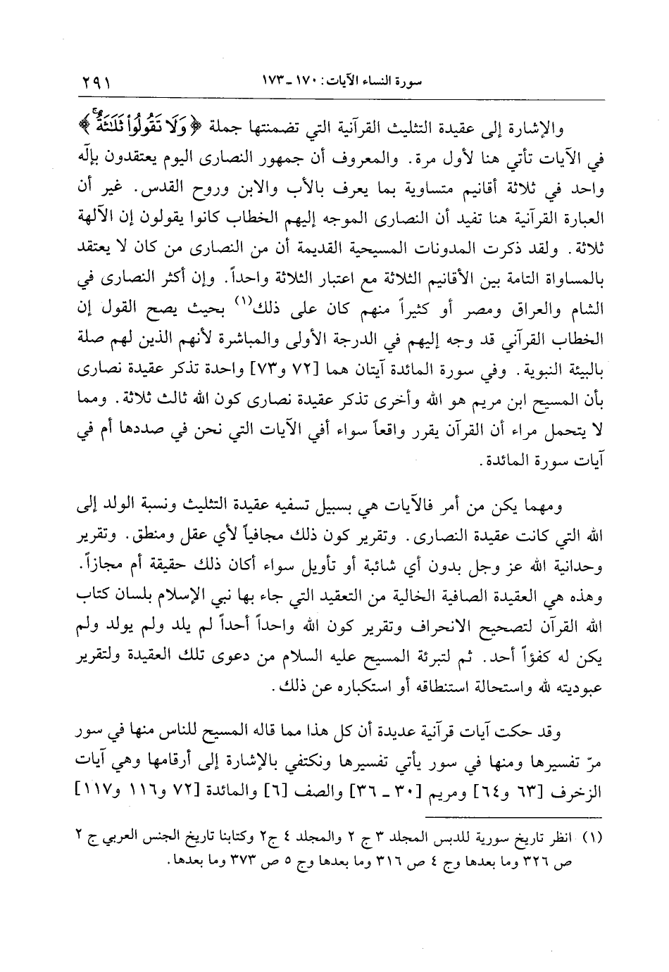 والإشارة إلى عقيدة التثليث القرآنية التي تضمنتها جملة وَلا تَقُولُوا ثَلاثَةٌ في الآيات تأتي هنا لأول مرة. والمعروف أن جمهور النصارى اليوم يعتقدون بإله واحد في ثلاثة أقانيم متساوية بما يعرف بالأب والابن وروح القدس. غير أن العبارة القرآنية هنا تفيد أن النصارى الموجه إليهم الخطاب كانوا يقولون إن الآلهة ثلاثة. ولقد ذكرت المدونات المسيحية القديمة أن من النصارى من كان لا يعتقد بالمساواة التامة بين الأقانيم الثلاثة مع اعتبار الثلاثة واحدا. وإن أكثر النصارى في الشام والعراق ومصر أو كثيرا منهم كان على ذلك «1» بحيث يصح القول إن الخطاب القرآني قد وجه إليهم في الدرجة الأولى والمباشرة لأنهم الذين لهم صلة بالبيئة النبوية. وفي سورة المائدة آيتان هما [72 و 73] واحدة تذكر عقيدة نصارى بأن المسيح ابن مريم هو الله وأخرى تذكر عقيدة نصارى كون الله ثالث ثلاثة. ومما لا يتحمل مراء أن القرآن يقرر واقعا سواء أفي الآيات التي نحن في صددها أم في آيات سورة المائدة.