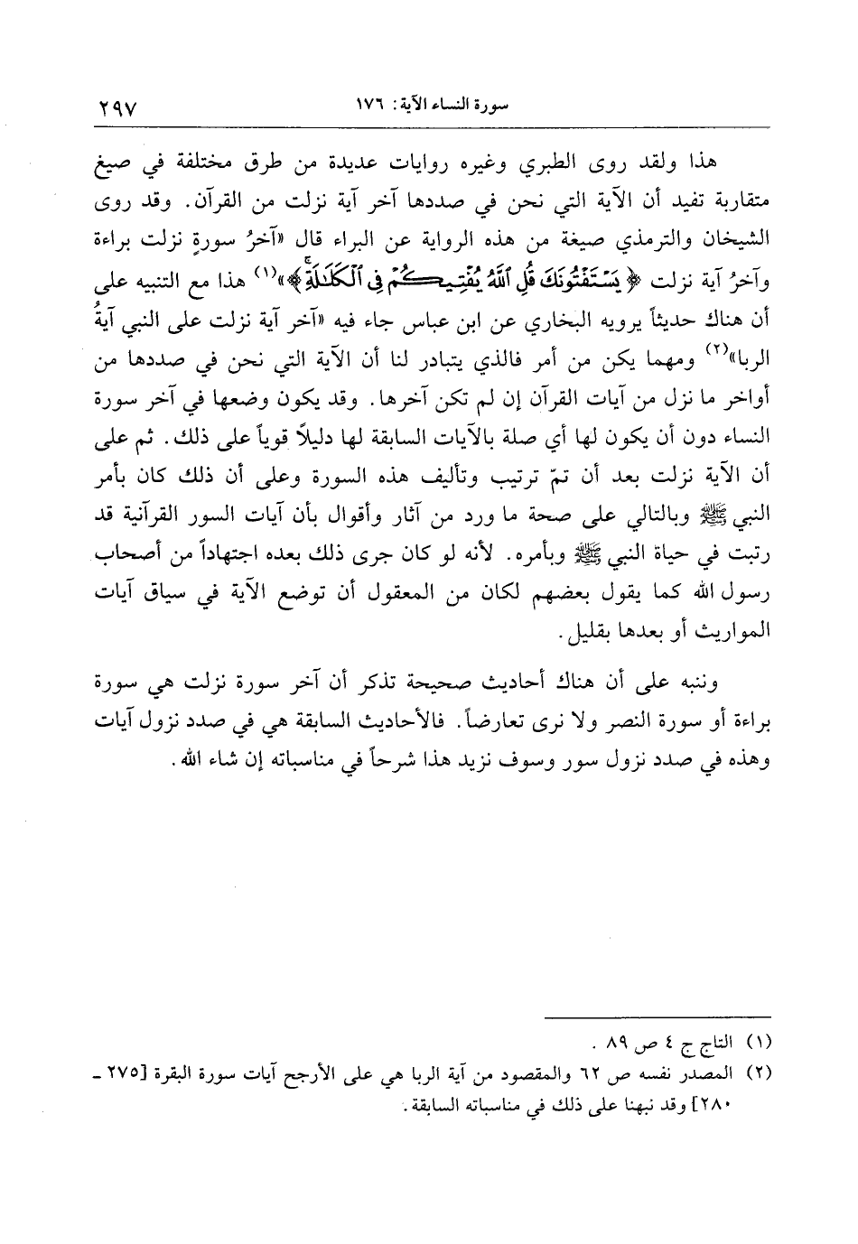 هذا ولقد روى الطبري وغيره روايات عديدة من طرق مختلفة في صيغ متقاربة تفيد أن الآية التي نحن في صددها آخر آية نزلت من القرآن. وقد روى الشيخان والترمذي صيغة من هذه الرواية عن البراء قال «آخر سورة نزلت براءة وآخر آية نزلت يَسْتَفْتُونَكَ قُلِ اللَّهُ يُفْتِيكُمْ فِي الْكَلالَةِ» «1» هذا مع التنبيه على أن هناك حديثا يرويه البخاري عن ابن عباس جاء فيه «آخر آية نزلت على النبي آية الربا» «2» ومهما يكن من أمر فالذي يتبادر لنا أن الآية التي نحن في صددها من أواخر ما نزل من آيات القرآن إن لم تكن آخرها. وقد يكون وضعها في آخر سورة النساء دون أن يكون لها أي صلة بالآيات السابقة لها دليلا قويا على ذلك. ثم على أن الآية نزلت بعد أن تمّ ترتيب وتأليف هذه السورة وعلى أن ذلك كان بأمر النبي صلى الله عليه وسلم وبالتالي على صحة ما ورد من آثار وأقوال بأن آيات السور القرآنية قد رتبت في حياة النبي صلى الله عليه وسلم وبأمره. لأنه لو كان جرى ذلك بعده اجتهادا من أصحاب رسول الله كما يقول بعضهم لكان من المعقول أن توضع الآية في سياق آيات المواريث أو بعدها بقليل.