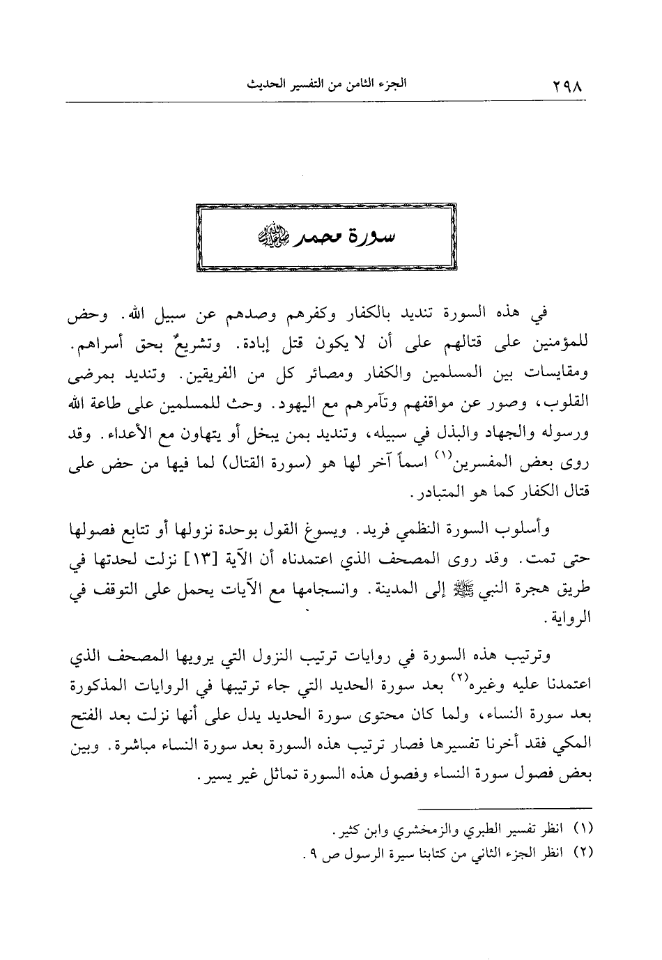 ومقايسات بين المسلمين والكفار ومصائر كل من الفريقين. وتنديد بمرضى القلوب، وصور عن مواقفهم وتآمرهم مع اليهود. وحث للمسلمين على طاعة الله ورسوله والجهاد والبذل في سبيله، وتنديد بمن يبخل أو يتهاون مع الأعداء. وقد روى بعض المفسرين «1» اسما آخر لها هو (سورة القتال) لما فيها من حض على قتال الكفار كما هو المتبادر.