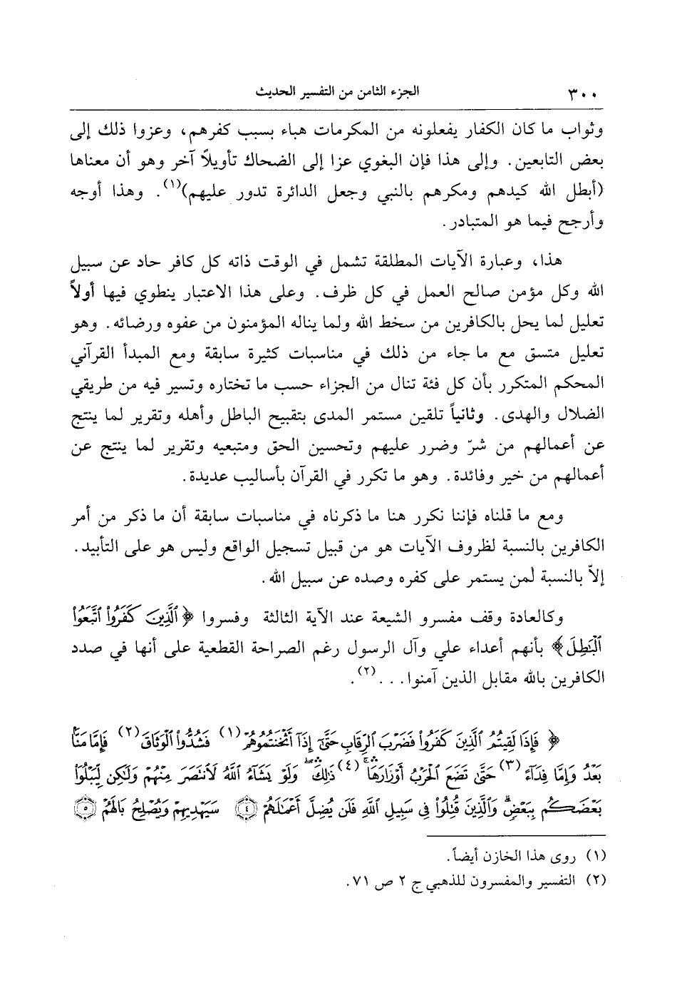 وكالعادة وقف مفسرو الشيعة عند الآية الثالثة وفسروا الَّذِينَ كَفَرُوا اتَّبَعُوا الْباطِلَ بأنهم أعداء علي وآل الرسول رغم الصراحة القطعية على أنها في صدد الكافرين بالله مقابل الذين آمنوا ... «2» .