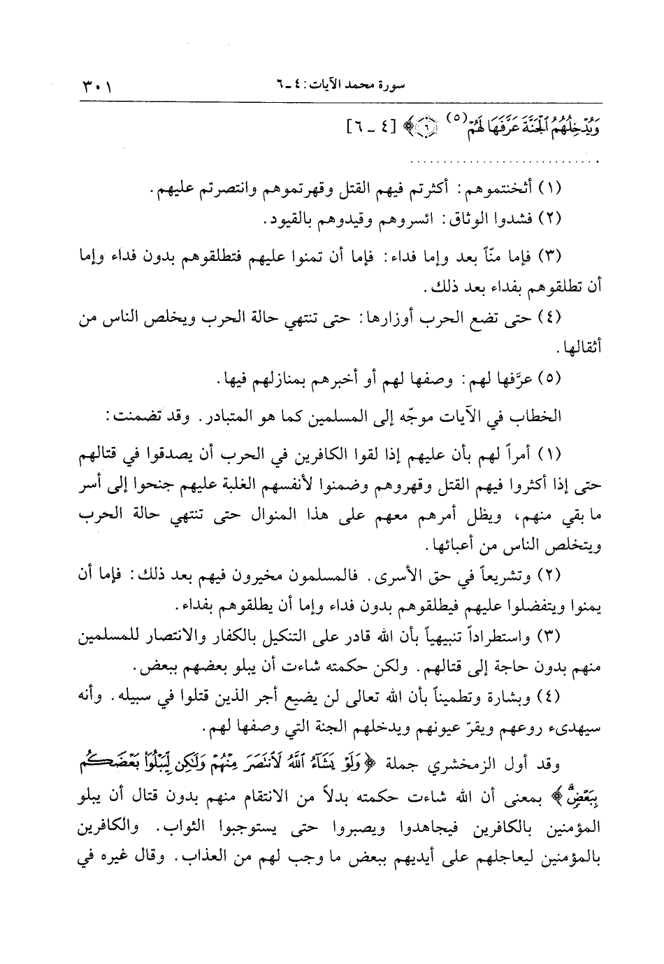 (2) وتشريعا في حق الأسرى. فالمسلمون مخيرون فيهم بعد ذلك: فإما أن يمنوا ويتفضلوا عليهم فيطلقوهم بدون فداء وإما أن يطلقوهم بفداء.