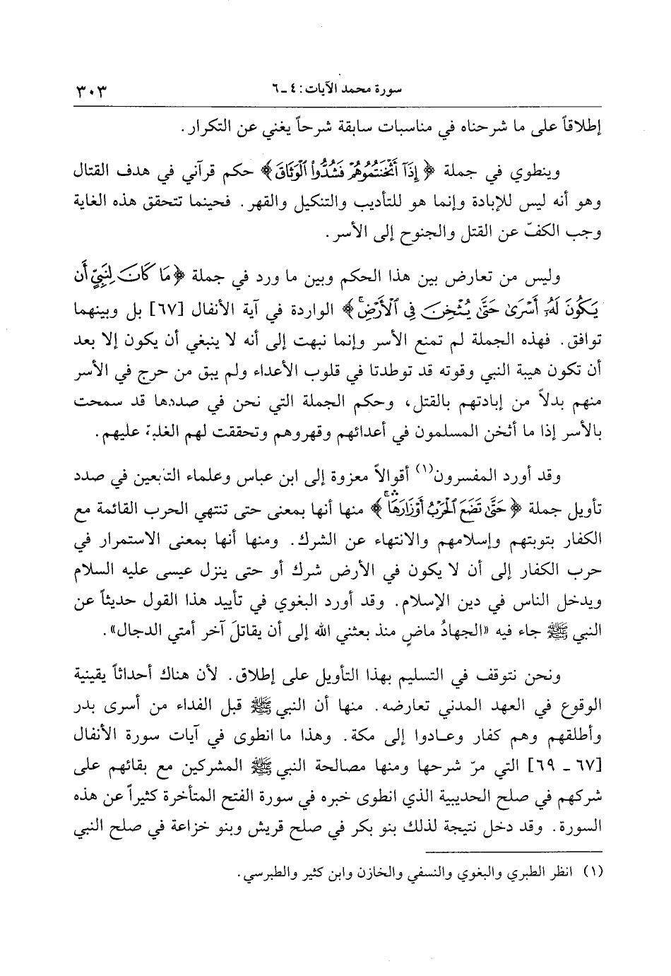 أقوالا معزوة إلى ابن عباس وعلماء التابعين في صدد تأويل جملة حَتَّى تَضَعَ الْحَرْبُ أَوْزارَها منها أنها بمعنى حتى تنتهي الحرب القائمة مع الكفار بتوبتهم وإسلامهم والانتهاء عن الشرك. ومنها أنها بمعنى الاستمرار في حرب الكفار إلى أن لا يكون في الأرض شرك أو حتى ينزل عيسى عليه السلام ويدخل الناس في دين الإسلام. وقد أورد البغوي في تأييد هذا القول حديثا عن النبي صلى الله عليه وسلم جاء فيه «الجهاد ماض منذ بعثني الله إلى أن يقاتل آخر أمتي الدجال» .