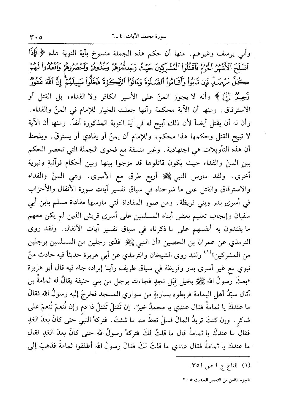 وأبي يوسف وغيرهم. منها أن حكم هذه الجملة منسوخ بآية التوبة هذه فَإِذَا انْسَلَخَ الْأَشْهُرُ الْحُرُمُ فَاقْتُلُوا الْمُشْرِكِينَ حَيْثُ وَجَدْتُمُوهُمْ وَخُذُوهُمْ وَاحْصُرُوهُمْ وَاقْعُدُوا لَهُمْ كُلَّ مَرْصَدٍ فَإِنْ تابُوا وَأَقامُوا الصَّلاةَ وَآتَوُا الزَّكاةَ فَخَلُّوا سَبِيلَهُمْ إِنَّ اللَّهَ غَفُورٌ رَحِيمٌ (5) وأنه لا يجوز المنّ على الأسير الكافر ولا الفداء، بل القتل أو الاسترقاق. ومنها أن الآية محكمة وأنها جعلت الخيار للإمام في المنّ والفداء.