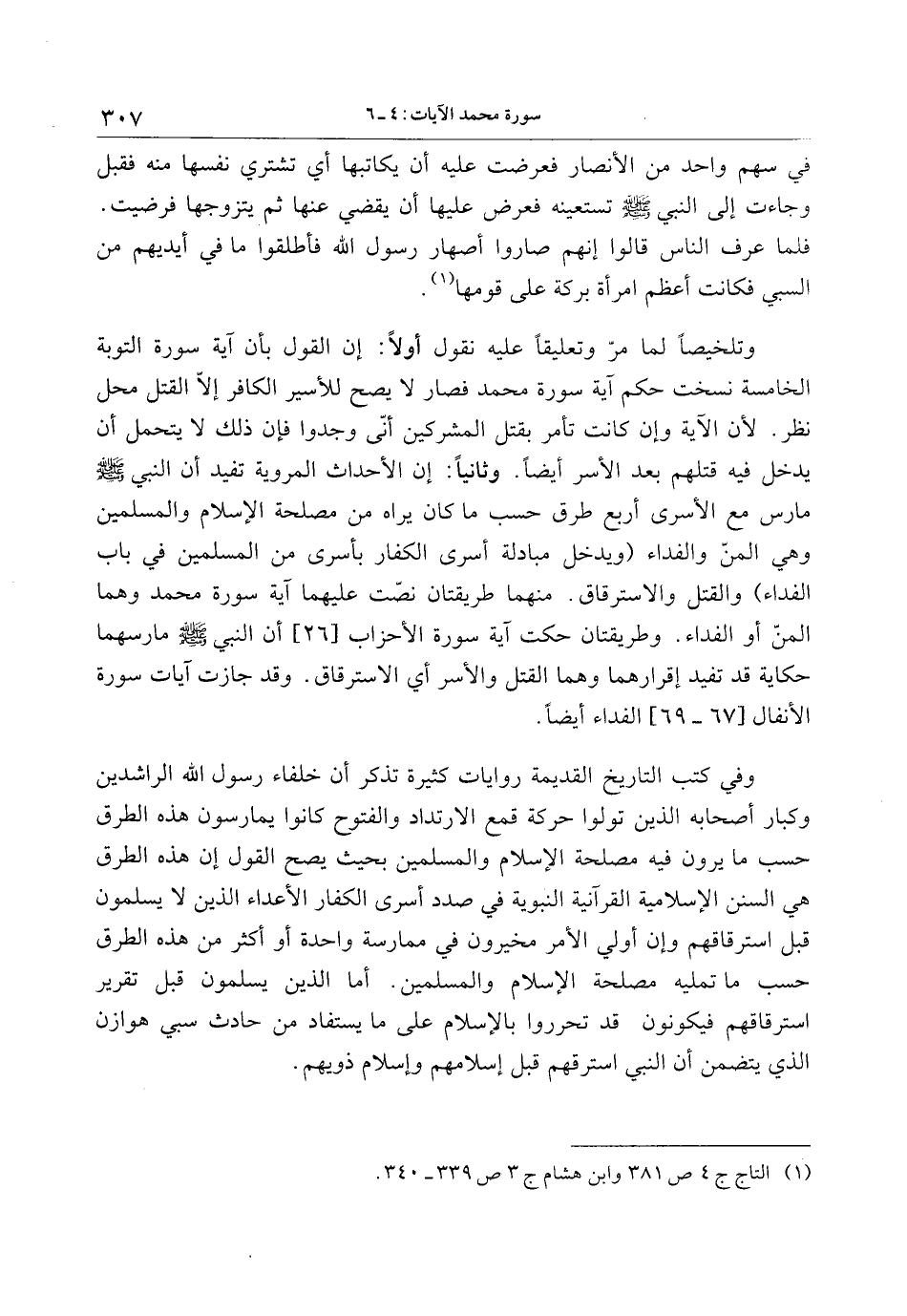 وتلخيصا لما مرّ وتعليقا عليه نقول أولا: إن القول بأن آية سورة التوبة الخامسة نسخت حكم آية سورة محمد فصار لا يصح للأسير الكافر إلّا القتل محل نظر. لأن الآية وإن كانت تأمر بقتل المشركين أنّى وجدوا فإن ذلك لا يتحمل أن يدخل فيه قتلهم بعد الأسر أيضا. وثانيا: إن الأحداث المروية تفيد أن النبي صلى الله عليه وسلم مارس مع الأسرى أربع طرق حسب ما كان يراه من مصلحة الإسلام والمسلمين وهي المنّ والفداء (ويدخل مبادلة أسرى الكفار بأسرى من المسلمين في باب الفداء) والقتل والاسترقاق. منهما طريقتان نصّت عليهما آية سورة محمد وهما المنّ أو الفداء. وطريقتان حكت آية سورة الأحزاب [26] أن النبي صلى الله عليه وسلم مارسهما حكاية قد تفيد إقرارهما وهما القتل والأسر أي الاسترقاق. وقد جازت آيات سورة الأنفال [67- 69] الفداء أيضا.