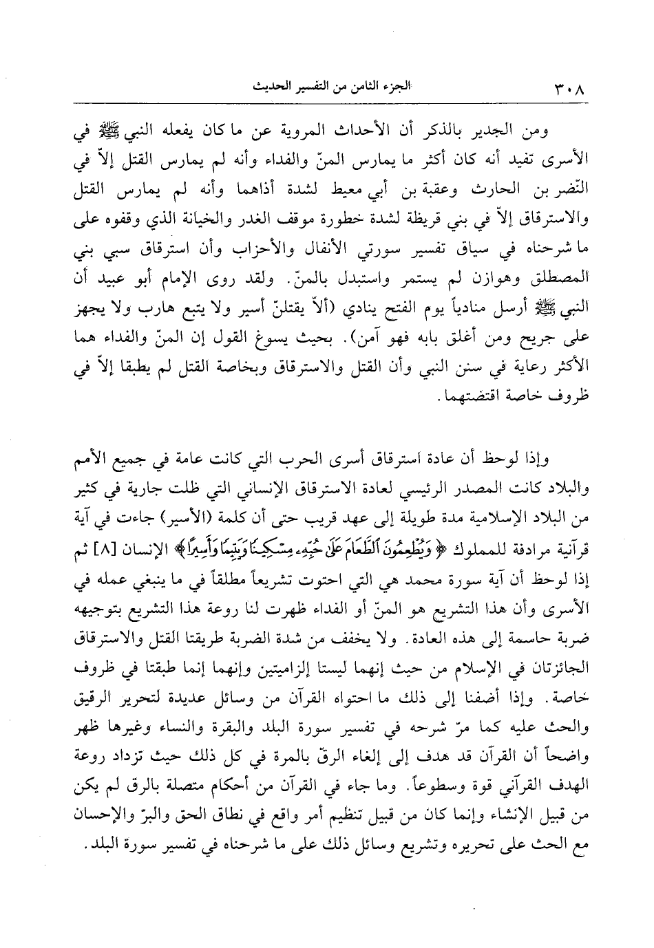 وإذا لوحظ أن عادة استرقاق أسرى الحرب التي كانت عامة في جميع الأمم والبلاد كانت المصدر الرئيسي لعادة الاسترقاق الإنساني التي ظلت جارية في كثير من البلاد الإسلامية مدة طويلة إلى عهد قريب حتى أن كلمة (الأسير) جاءت في آية قرآنية مرادفة للمملوك وَيُطْعِمُونَ الطَّعامَ عَلى حُبِّهِ مِسْكِيناً وَيَتِيماً وَأَسِيراً الإنسان [8] ثم إذا لوحظ أن آية سورة محمد هي التي احتوت تشريعا مطلقا في ما ينبغي عمله في الأسرى وأن هذا التشريع هو المنّ أو الفداء ظهرت لنا روعة هذا التشريع بتوجيهه ضربة حاسمة إلى هذه العادة. ولا يخفف من شدة الضربة طريقتا القتل والاسترقاق الجائزتان في الإسلام من حيث إنهما ليستا إلزاميتين وإنهما إنما طبقتا في ظروف خاصة. وإذا أضفنا إلى ذلك ما احتواه القرآن من وسائل عديدة لتحرير الرقيق والحث عليه كما مرّ شرحه في تفسير سورة البلد والبقرة والنساء وغيرها ظهر واضحا أن القرآن قد هدف إلى إلغاء الرقّ بالمرة في كل ذلك حيث تزداد روعة الهدف القرآني قوة وسطوعا. وما جاء في القرآن من أحكام متصلة بالرق لم يكن من قبيل الإنشاء وإنما كان من قبيل تنظيم أمر واقع في نطاق الحق والبرّ والإحسان مع الحث على تحريره وتشريع وسائل ذلك على ما شرحناه في تفسير سورة البلد.