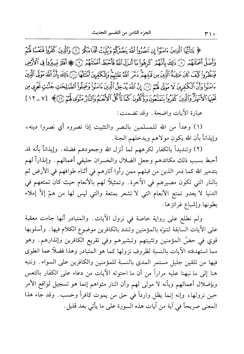 ولم نطلع على رواية خاصة في نزول الآيات. والمتبادر أنها جاءت معقبة على الآيات السابقة لتنوّه بالمؤمنين وتندد بالكافرين موضوع الكلام فيها. وأسلوبها قوي في حضّ المؤمنين وتثبيتهم وتبشيرهم وفي تقريع الكافرين وإنذارهم. وهو مما استهدفته الآيات بالنسبة لظروف نزولها كما هو المتبادر وهذا فضلا عما انطوى فيها من تلقين جليل مستمر المدى بالنسبة للمؤمنين والكافرين على السواء. وننبه هنا إلى ما نبهنا عليه مرارا من أن ما احتوته الآيات من دعاء على الكفار بالتعس وبإضلال أعمالهم وبأنه لا مولى لهم وأن النار مثواهم إنما هو تسجيل لواقع الأمر حين نزولها، وإنه إنما يظل واردا في حق من يموت كافرا وحسب. وقد جاء هذا المعنى صريحا في آية من آيات هذه السورة على ما يأتي بعد قليل.