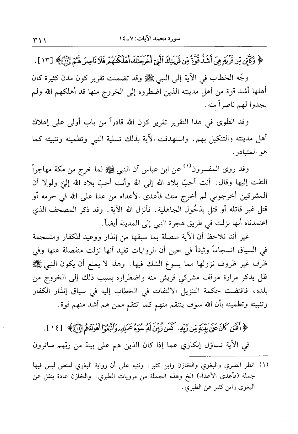 غير أننا نلاحظ أن الآية متصلة بما سبقها من إنذار ووعيد للكفار ومنسجمة في السياق انسجاما وثيقا في حين أن الروايات تفيد أنها نزلت منفصلة عنها وفي ظرف غير ظروف نزولها مما يسوغ الشك فيها. وهذا لا يمنع أن يكون النبي صلى الله عليه وسلم ظل يذكر مرارة موقف مشركي قريش منه واضطراره بسبب ذلك إلى الخروج من بلده، فاقتضت حكمة التنزيل الالتفات في الخطاب إليه في سياق إنذار الكفار وتثبيته وتطمينه بأن الله سوف ينتقم منهم كما انتقم ممن هم أشد منهم قوة.