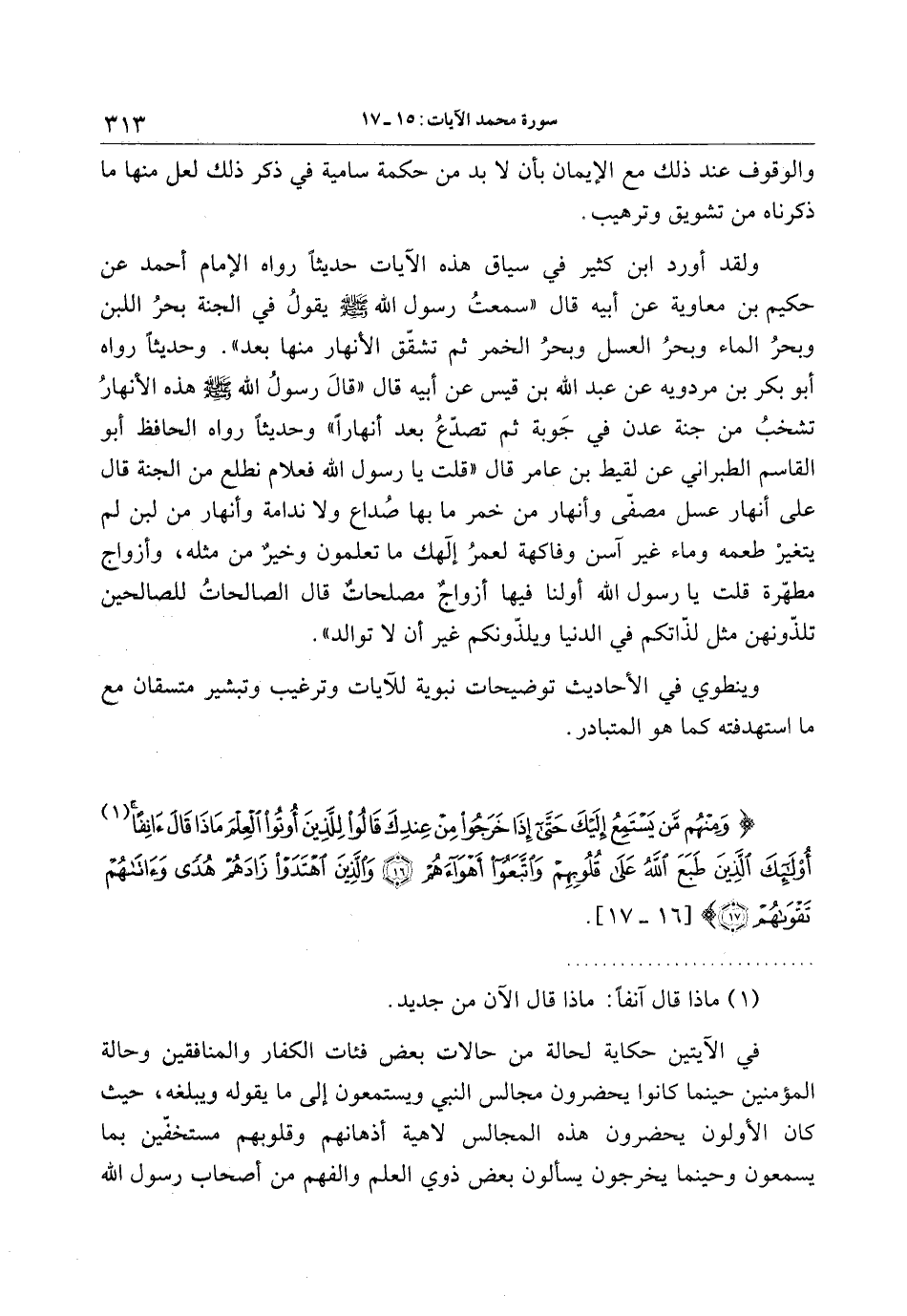 ولقد أورد ابن كثير في سياق هذه الآيات حديثا رواه الإمام أحمد عن حكيم بن معاوية عن أبيه قال «سمعت رسول الله صلى الله عليه وسلم يقول في الجنة بحر اللبن وبحر الماء وبحر العسل وبحر الخمر ثم تشقّق الأنهار منها بعد» . وحديثا رواه أبو بكر بن مردويه عن عبد الله بن قيس عن أبيه قال «قال رسول الله صلى الله عليه وسلم هذه الأنهار تشخب من جنة عدن في جوبة ثم تصدّع بعد أنهارا» وحديثا رواه الحافظ أبو القاسم الطبراني عن لقيط بن عامر قال «قلت يا رسول الله فعلام نطلع من الجنة قال على أنهار عسل مصفّى وأنهار من خمر ما بها صداع ولا ندامة وأنهار من لبن لم يتغير طعمه وماء غير آسن وفاكهة لعمر إلهك ما تعلمون وخير من مثله، وأزواج مطهّرة قلت يا رسول الله أولنا فيها أزواج مصلحات قال الصالحات للصالحين تلذّونهن مثل لذّاتكم في الدنيا ويلذّونكم غير أن لا توالد» .