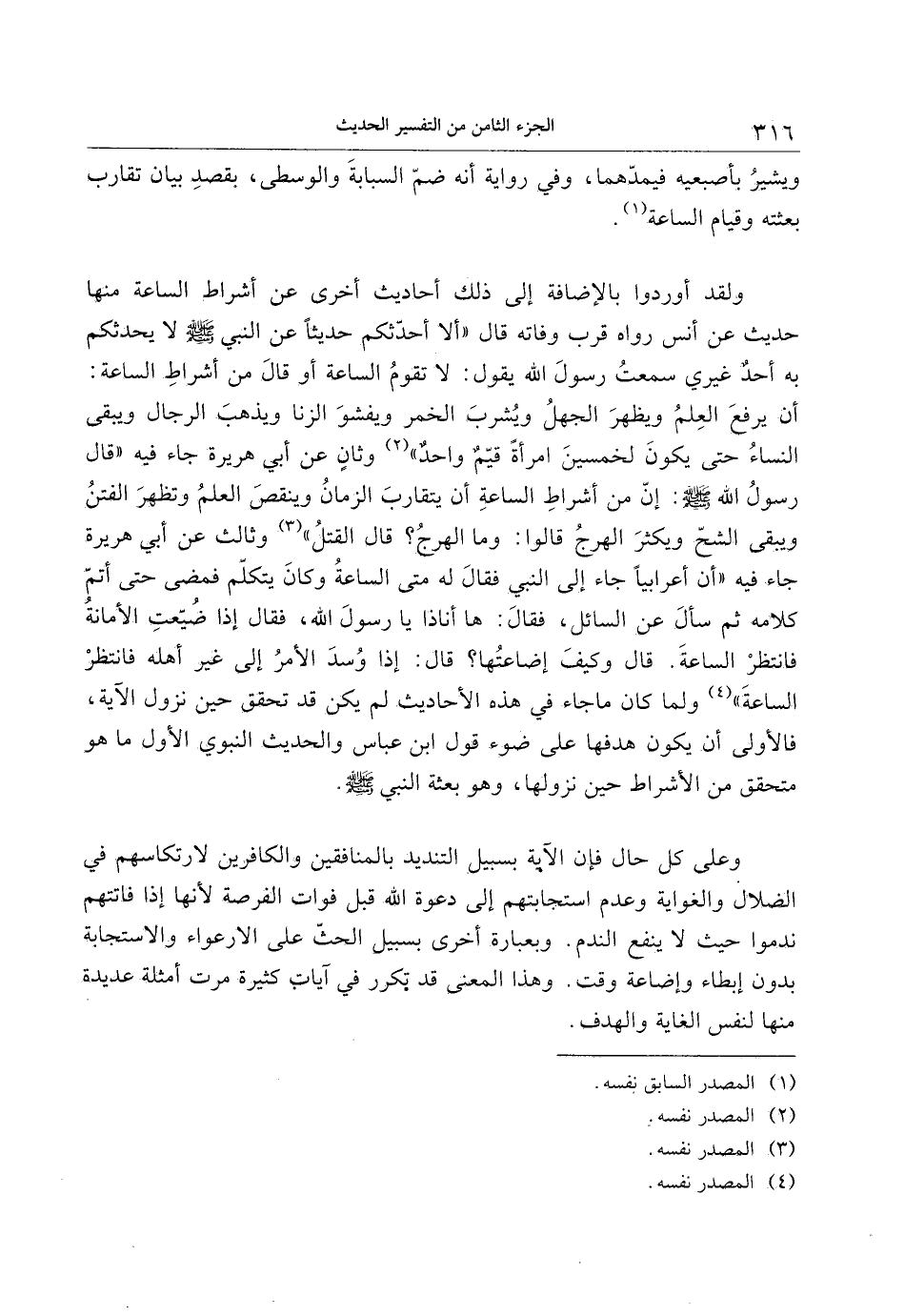 أن يرفع العلم ويظهر الجهل ويشرب الخمر ويفشو الزنا ويذهب الرجال ويبقى النساء حتى يكون لخمسين امرأة قيّم واحد» «2» وثان عن أبي هريرة جاء فيه «قال رسول الله صلى الله عليه وسلم: إنّ من أشراط الساعة أن يتقارب الزمان وينقص العلم وتظهر الفتن ويبقى الشحّ ويكثر الهرج قالوا: وما الهرج؟ قال القتل» «3» وثالث عن أبي هريرة جاء فيه «أن أعرابيا جاء إلى النبي فقال له متى الساعة وكان يتكلّم فمضى حتى أتمّ كلامه ثم سأل عن السائل، فقال: ها أنا ذا يا رسول الله، فقال إذا ضيّعت الأمانة فانتظر الساعة. قال وكيف إضاعتها؟ قال: إذا وسد الأمر إلى غير أهله فانتظر الساعة» «4» ولما كان ما جاء في هذه الأحاديث لم يكن قد تحقق حين نزول الآية، فالأولى أن يكون هدفها على ضوء قول ابن عباس والحديث النبوي الأول ما هو متحقق من الأشراط حين نزولها، وهو بعثة النبي صلى الله عليه وسلم.